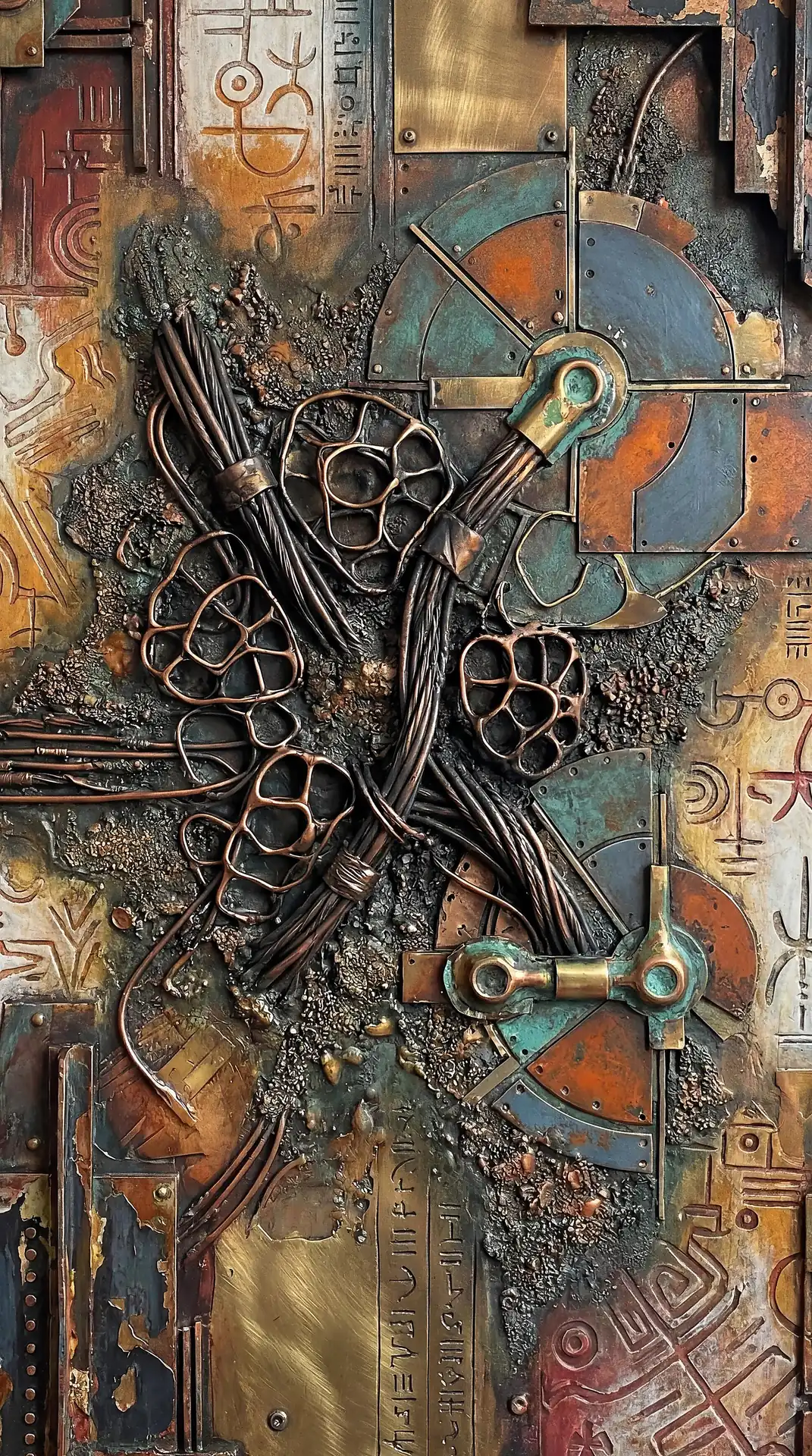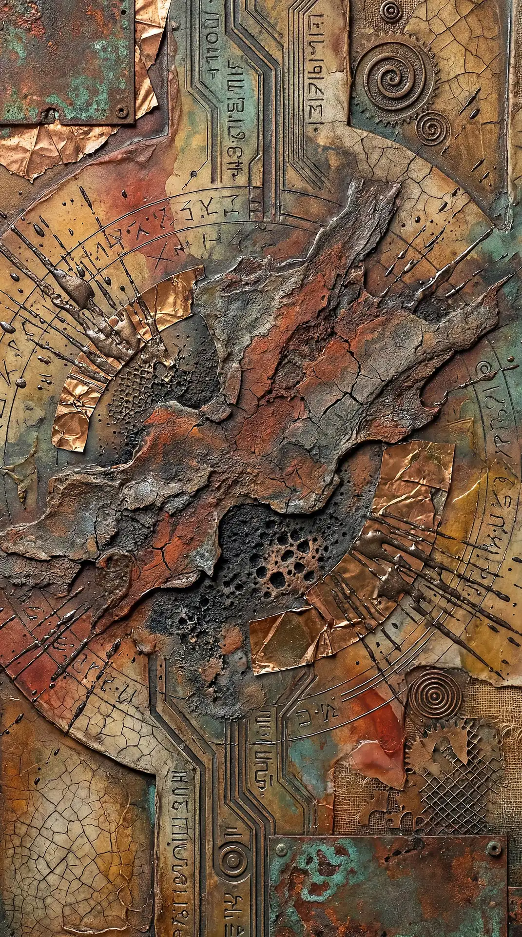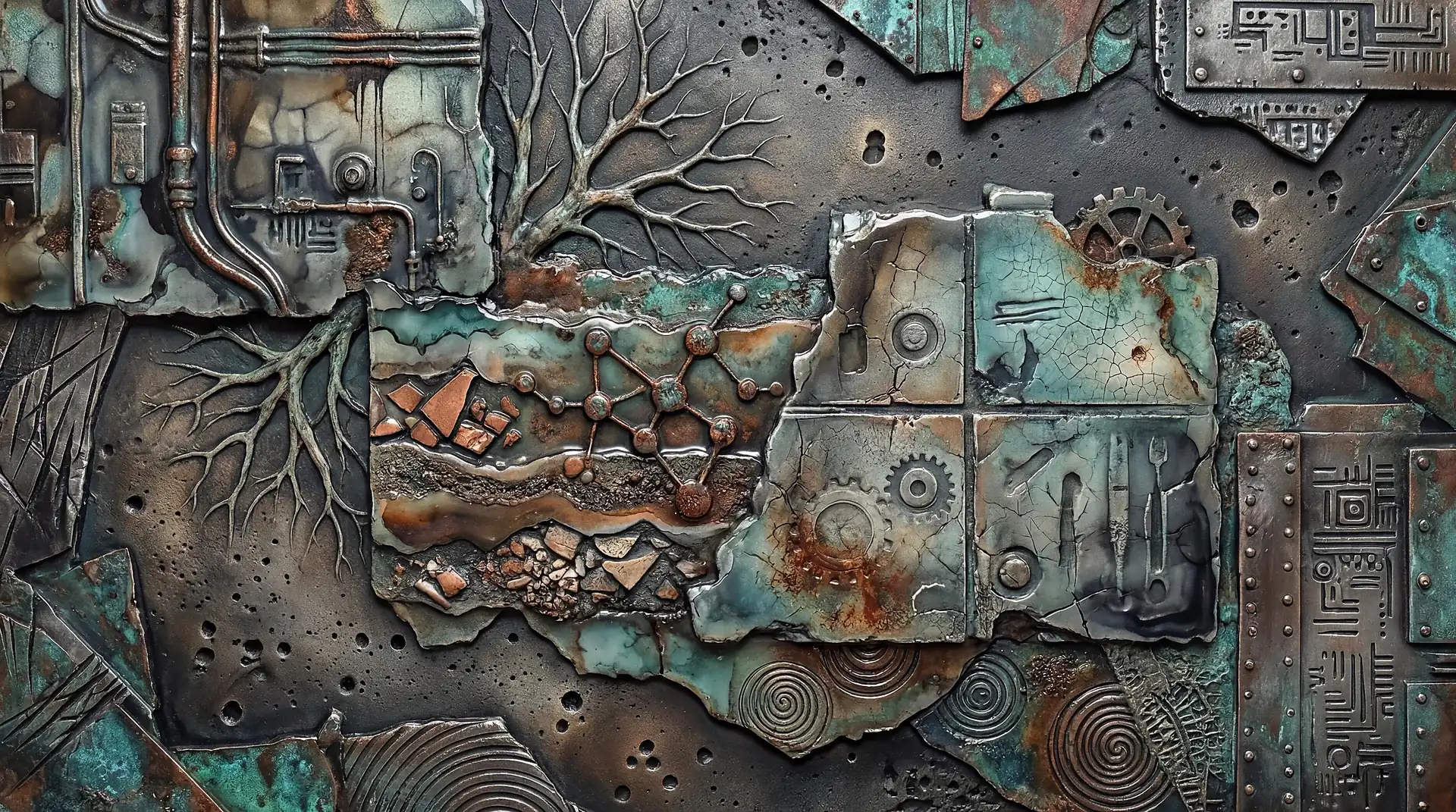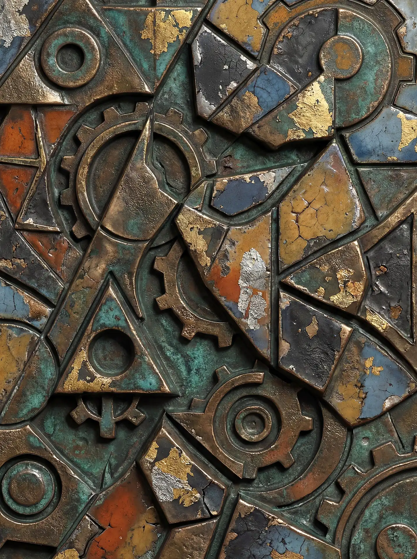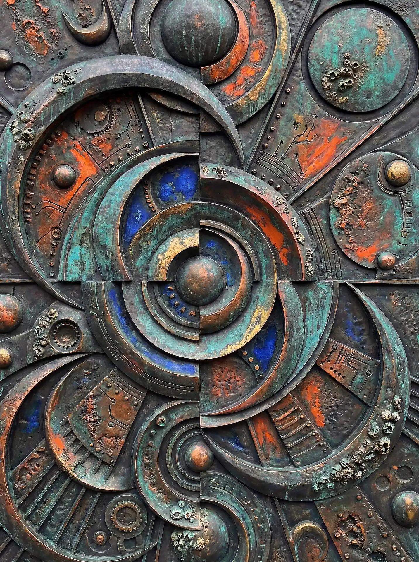 Color stays fundamentally grounded throughout these 173 Magnificent Industrial Relief Artworks. Copper and bronze absolutely dominate the palette—warm metallics ranging from bright new-penny gleam to dark aged-chocolate depth. Turquoise accents cut through strategically, the distinctive blue-green of oxidized copper providing essential cool contrast against overwhelming warmth. Occasional rusts and ochres add earthy undertones. Deep charcoals provide shadow anchors. The overall palette feels genuinely dug from mineral earth, refined from raw ore, shaped over time by chemistry and atmospheric exposure.