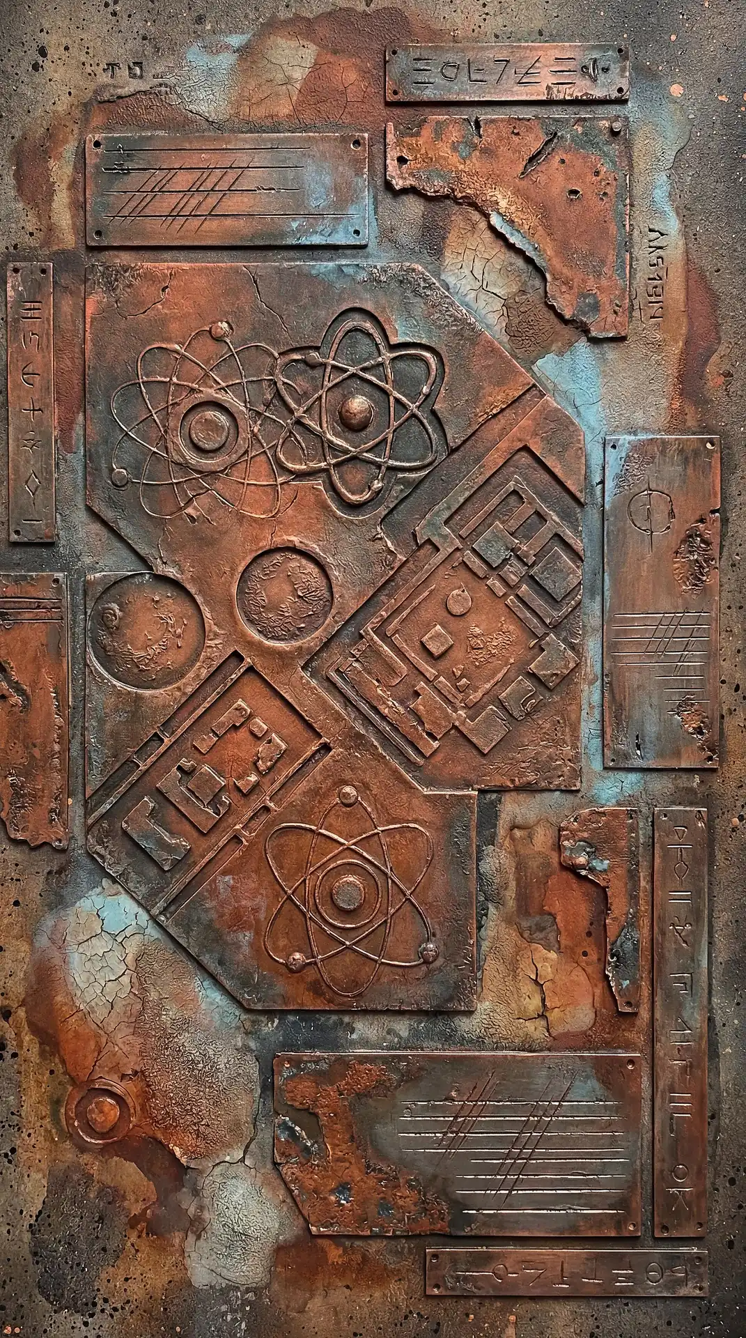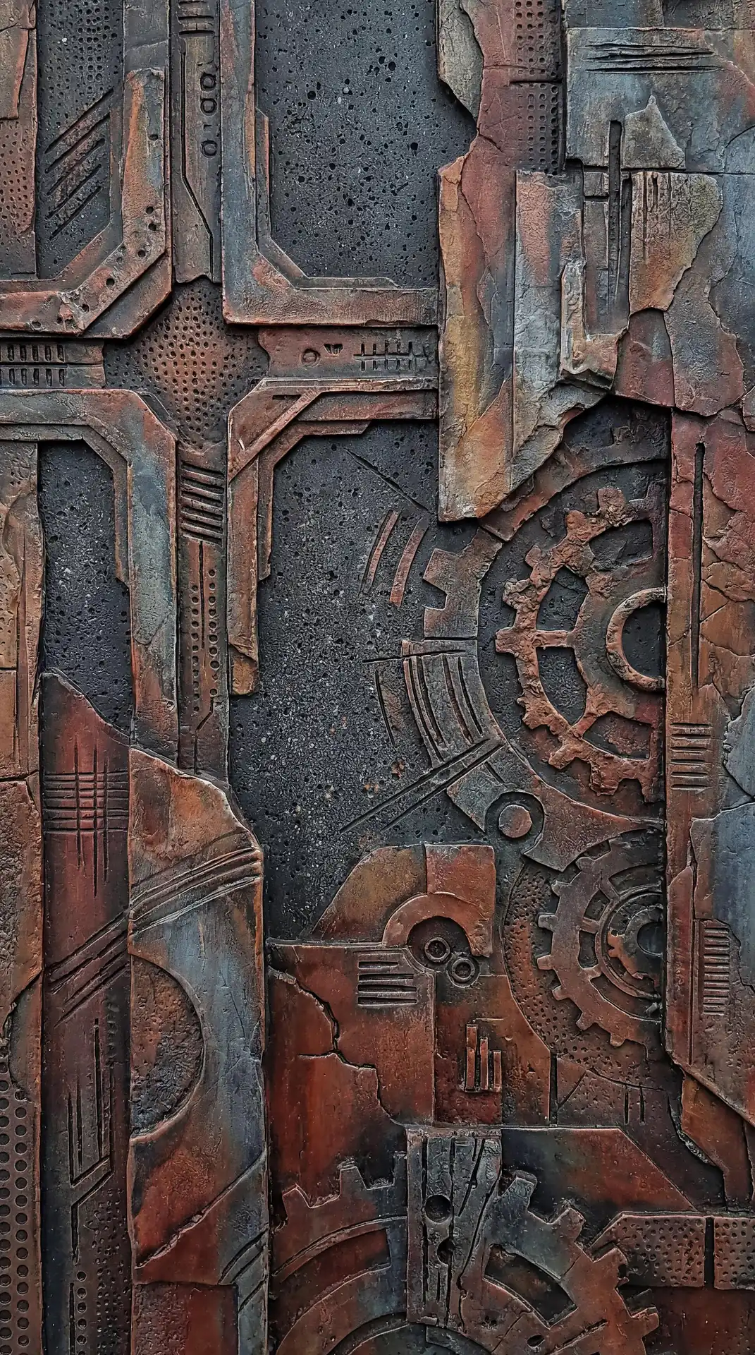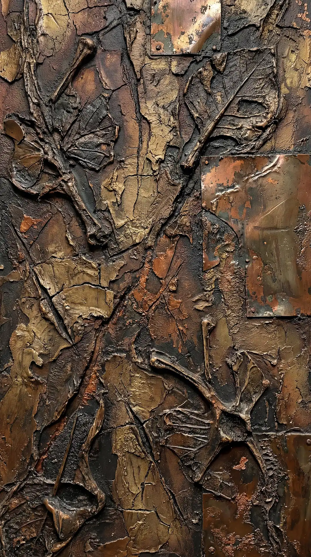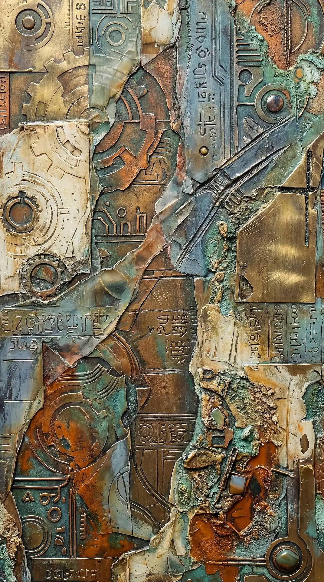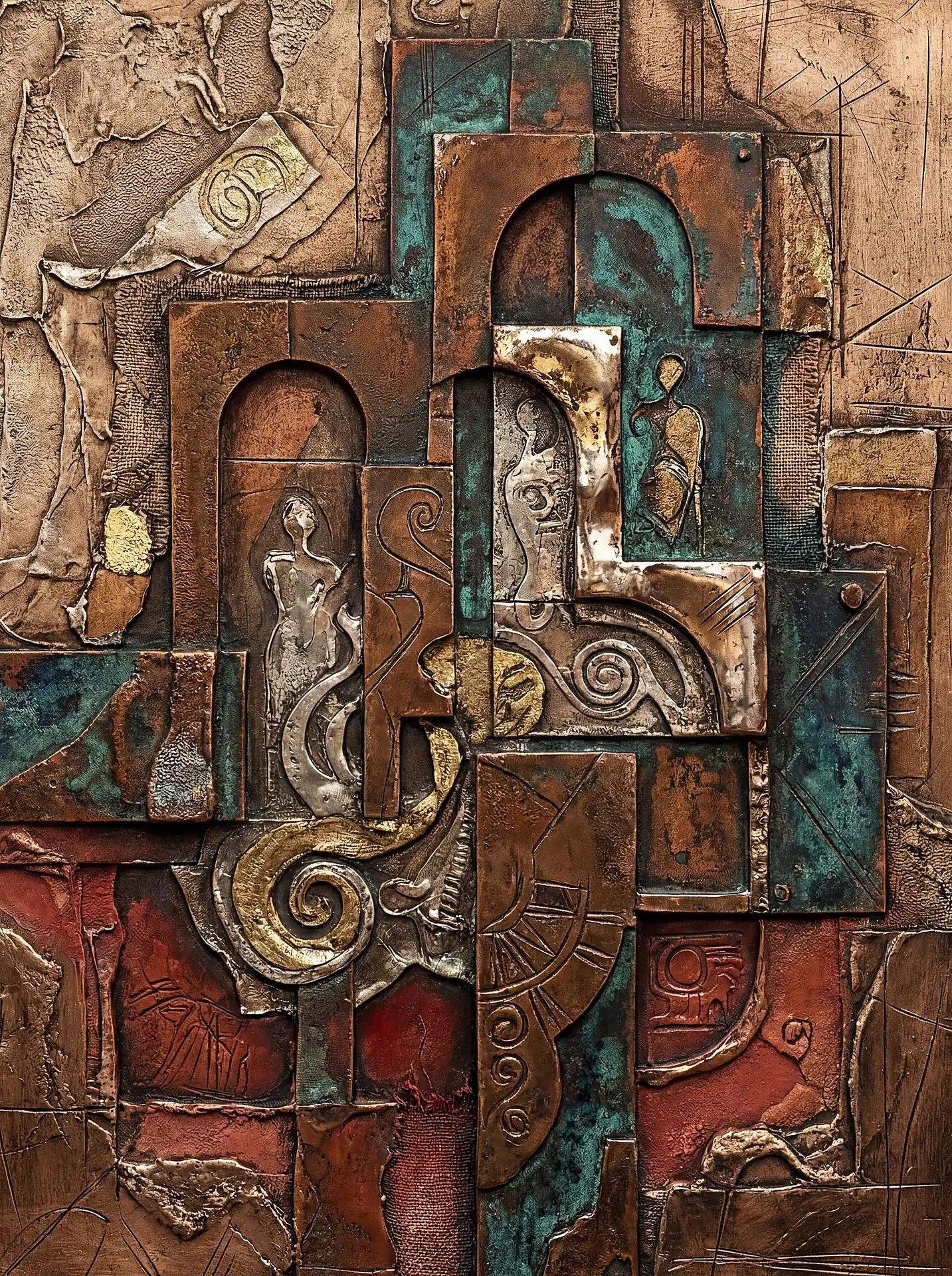 Color stays fundamentally grounded throughout these 173 Magnificent Industrial Relief Artworks. Copper and bronze absolutely dominate the palette—warm metallics ranging from bright new-penny gleam to dark aged-chocolate depth. Turquoise accents cut through strategically, the distinctive blue-green of oxidized copper providing essential cool contrast against overwhelming warmth. Occasional rusts and ochres add earthy undertones. Deep charcoals provide shadow anchors. The overall palette feels genuinely dug from mineral earth, refined from raw ore, shaped over time by chemistry and atmospheric exposure.