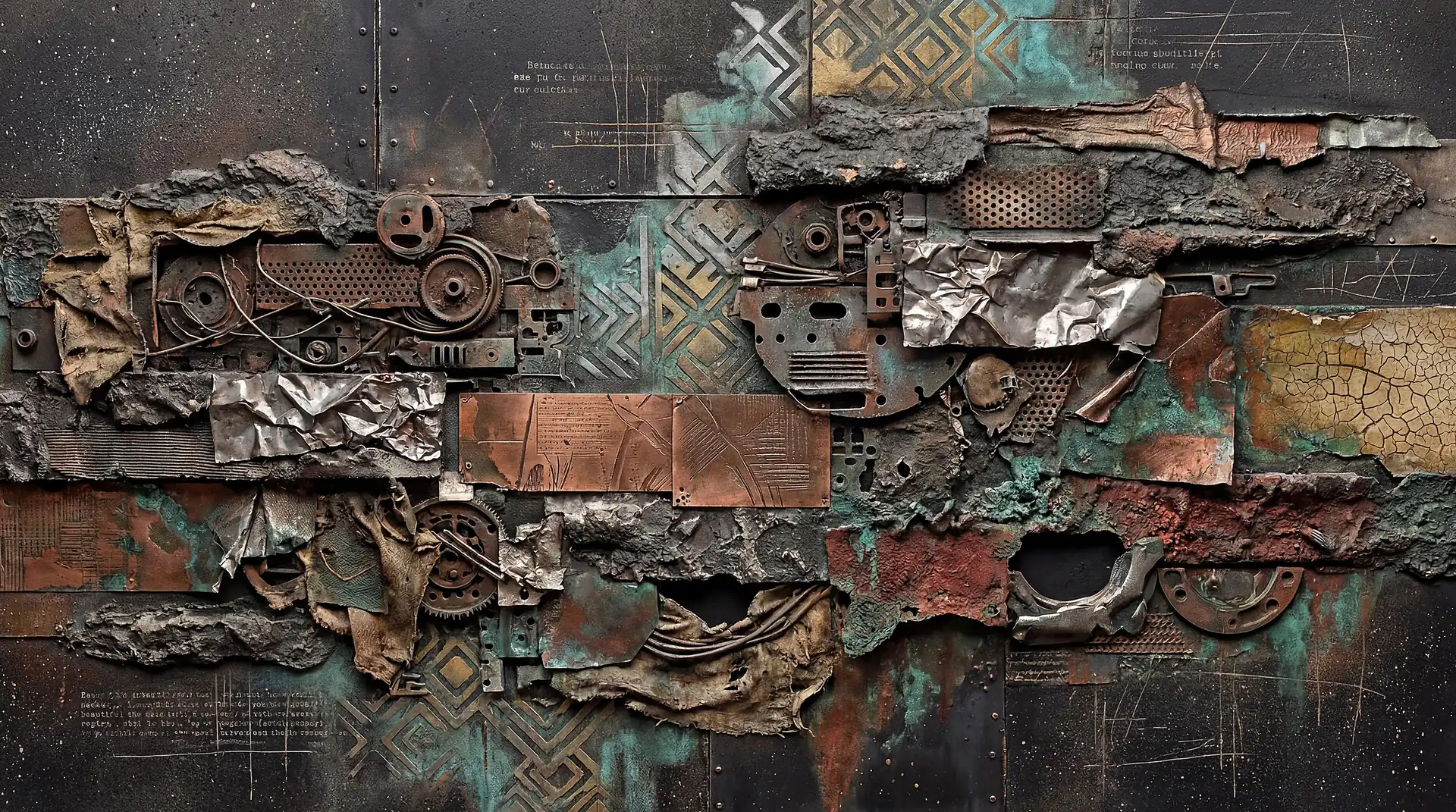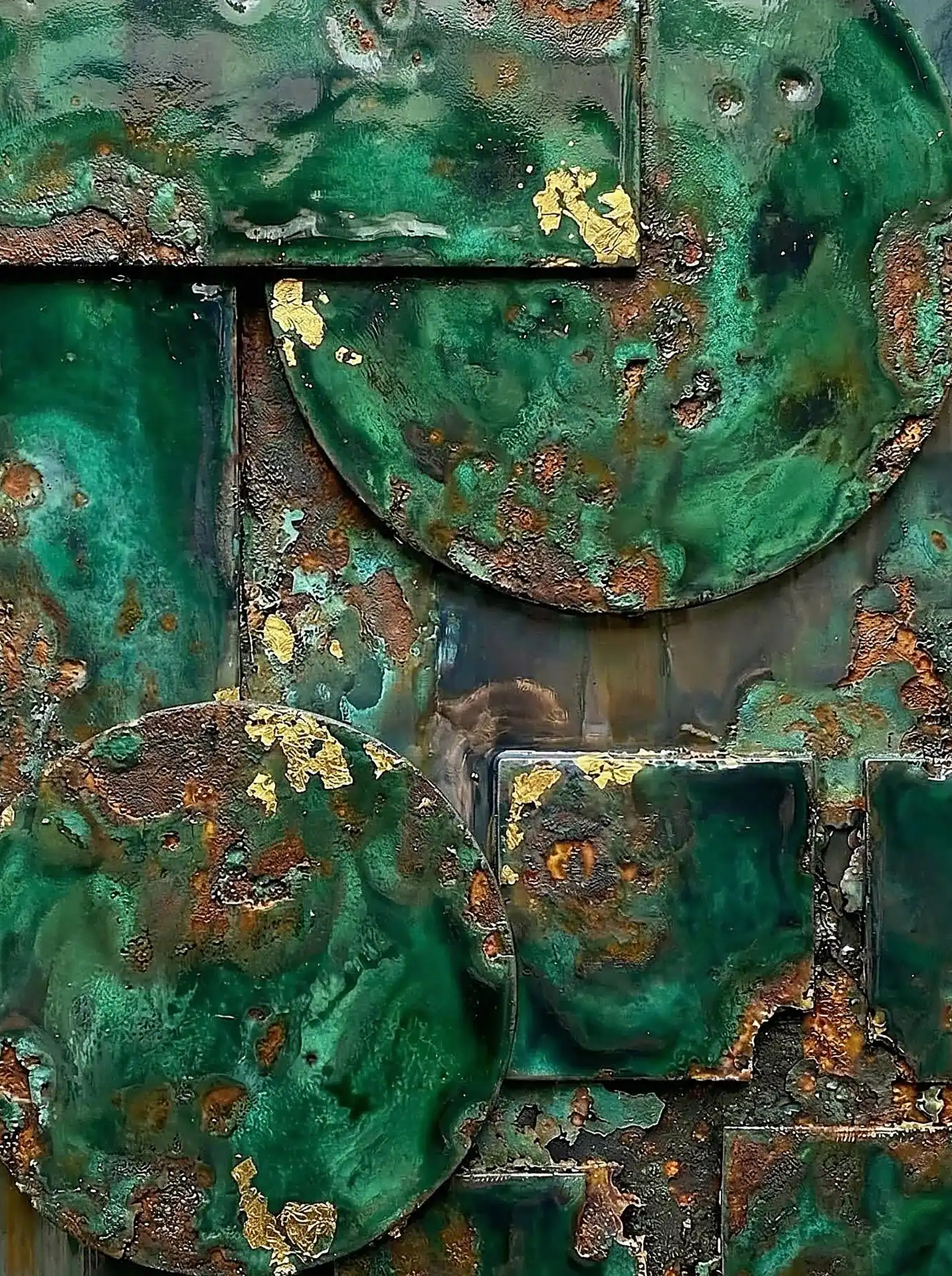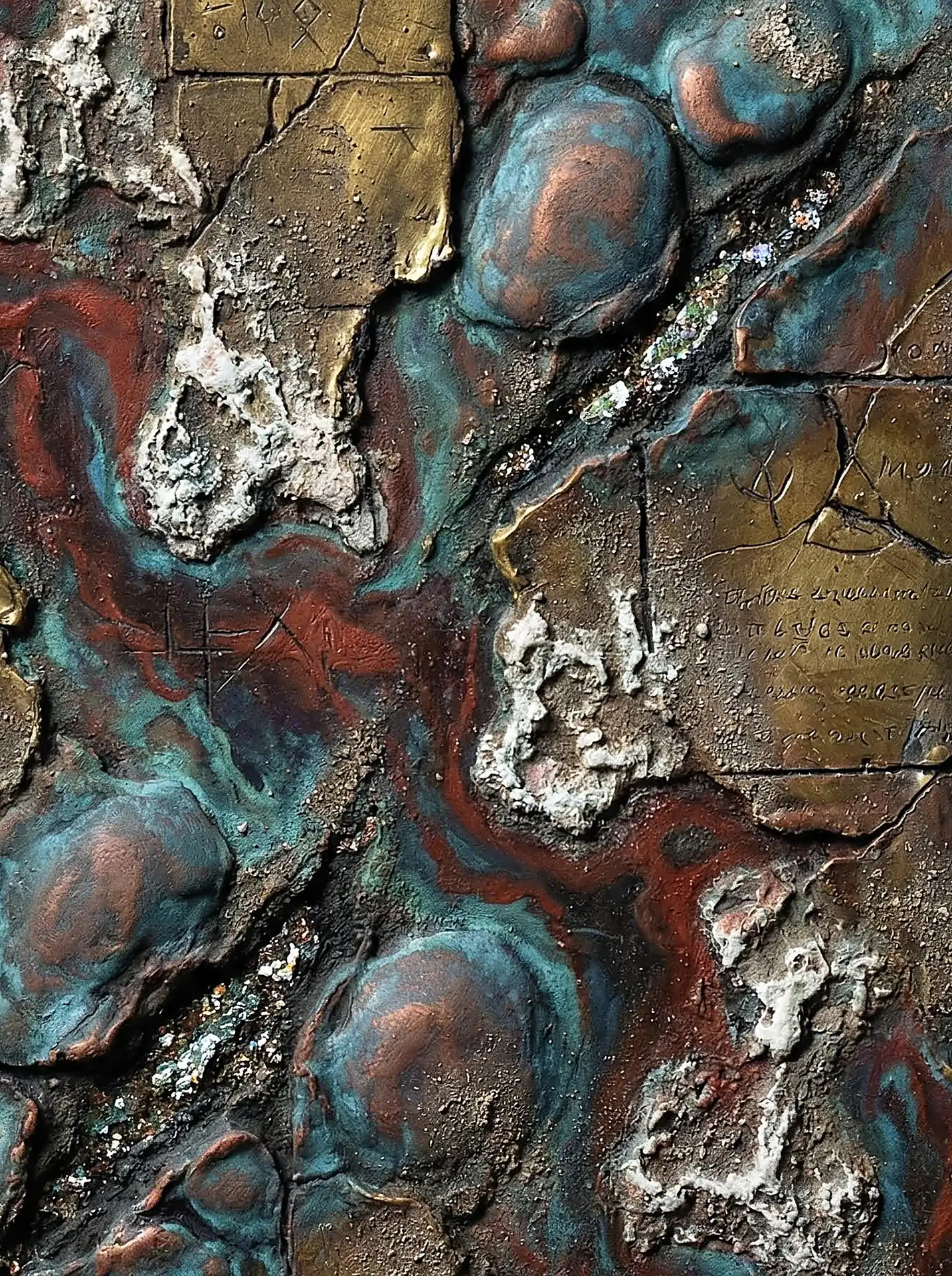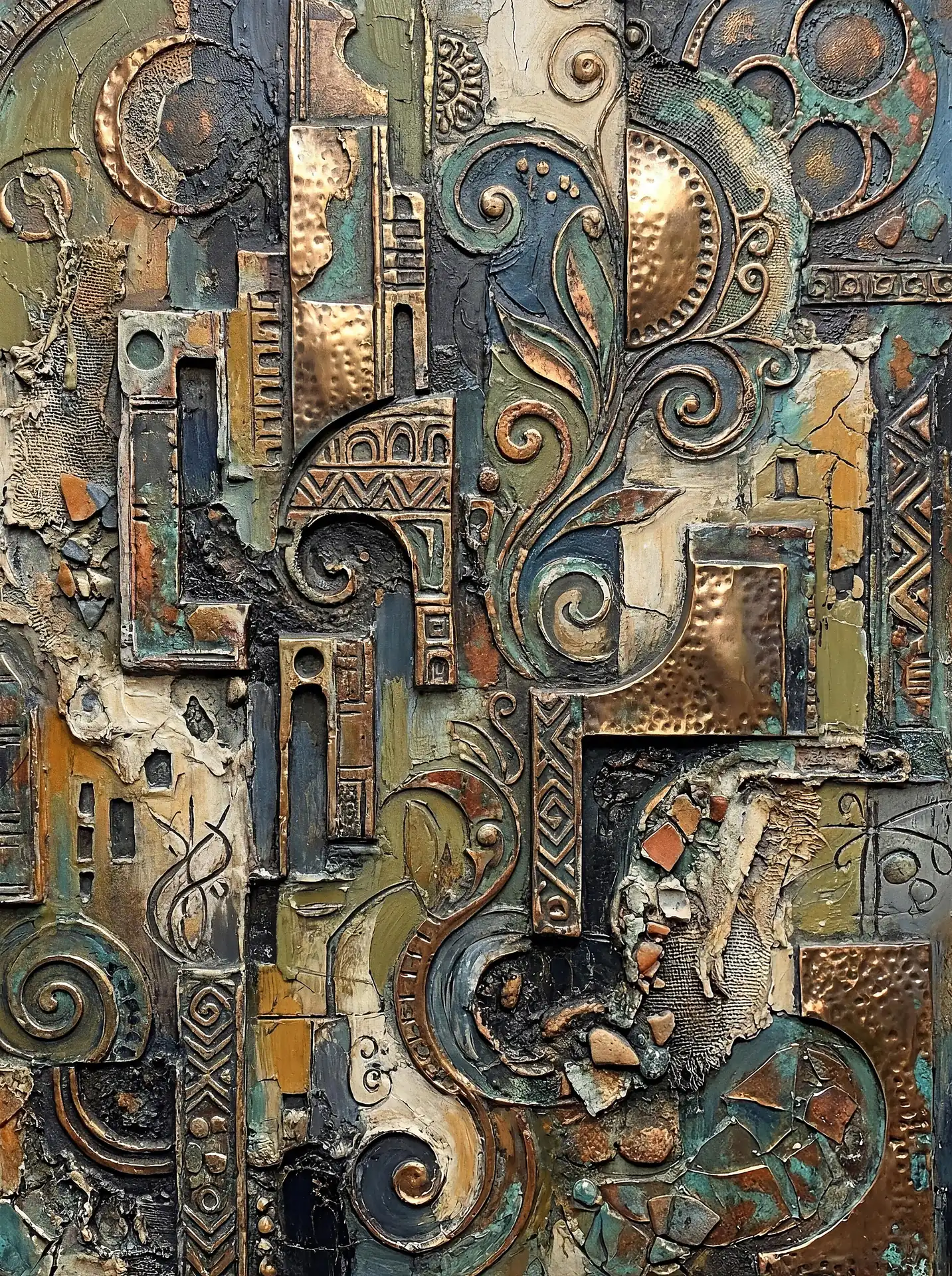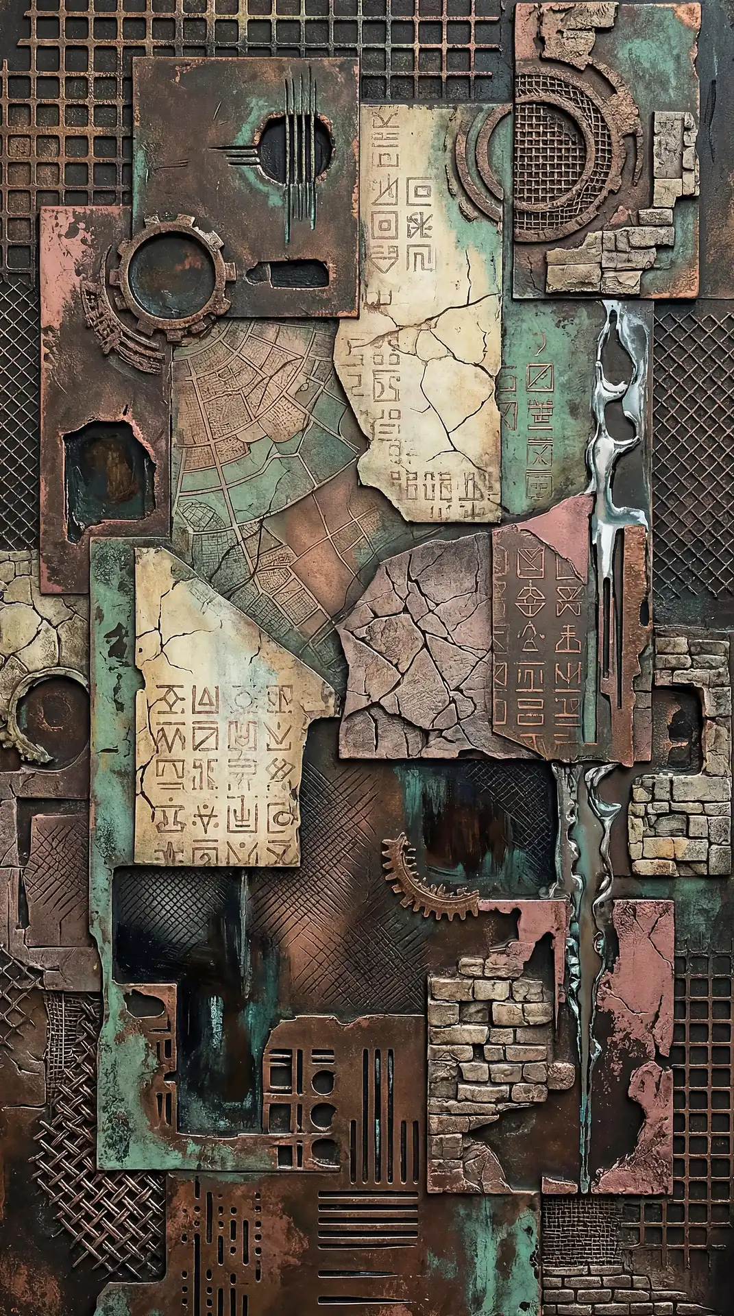 Color stays fundamentally grounded throughout these 173 Magnificent Industrial Relief Artworks. Copper and bronze absolutely dominate the palette—warm metallics ranging from bright new-penny gleam to dark aged-chocolate depth. Turquoise accents cut through strategically, the distinctive blue-green of oxidized copper providing essential cool contrast against overwhelming warmth. Occasional rusts and ochres add earthy undertones. Deep charcoals provide shadow anchors. The overall palette feels genuinely dug from mineral earth, refined from raw ore, shaped over time by chemistry and atmospheric exposure.