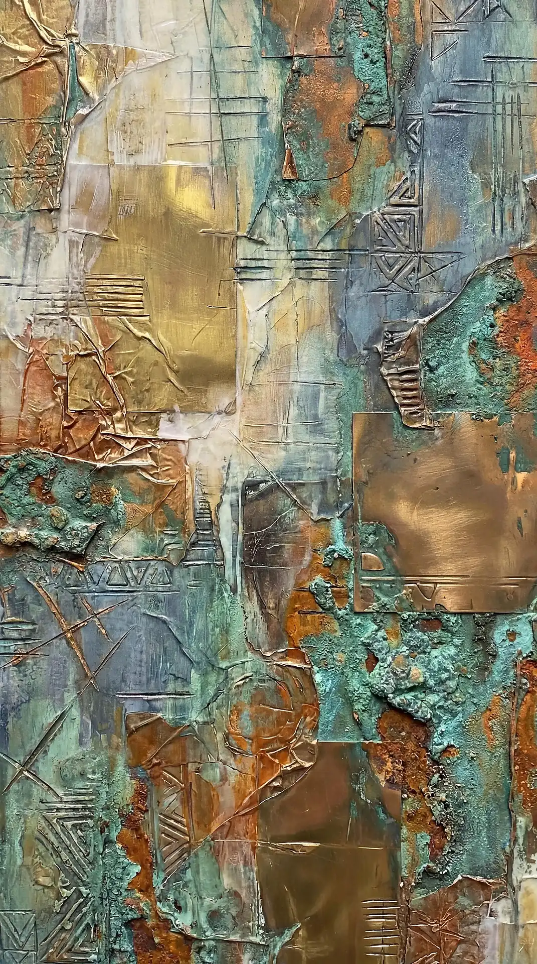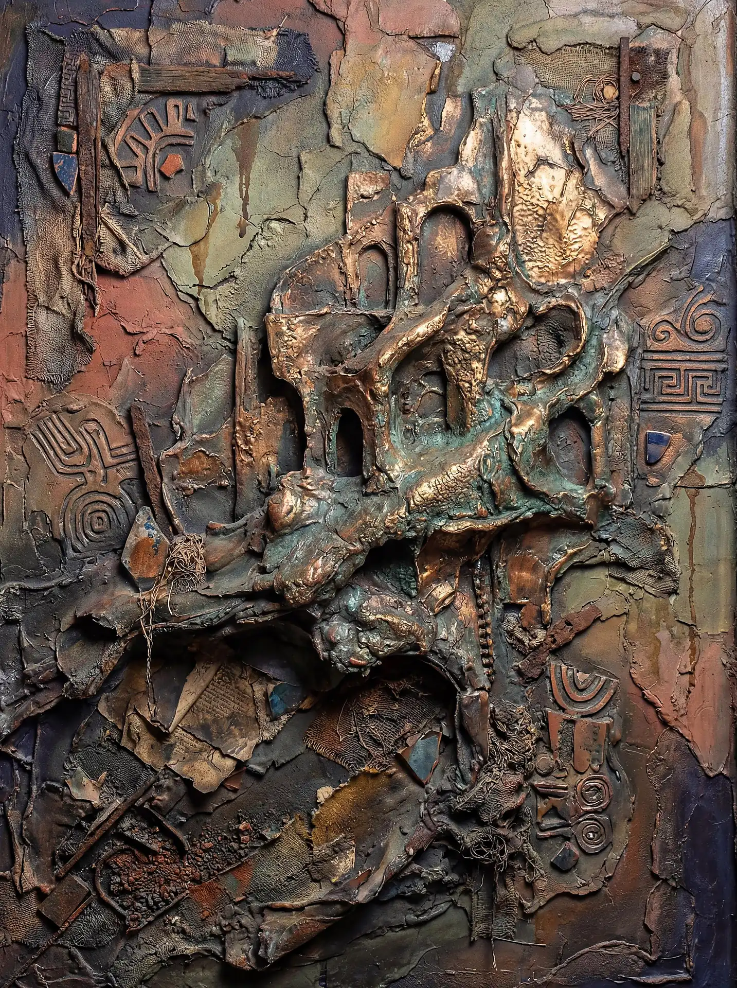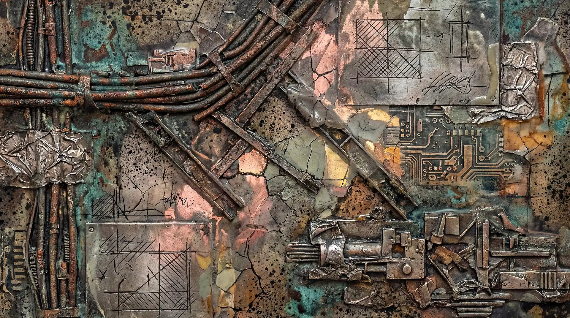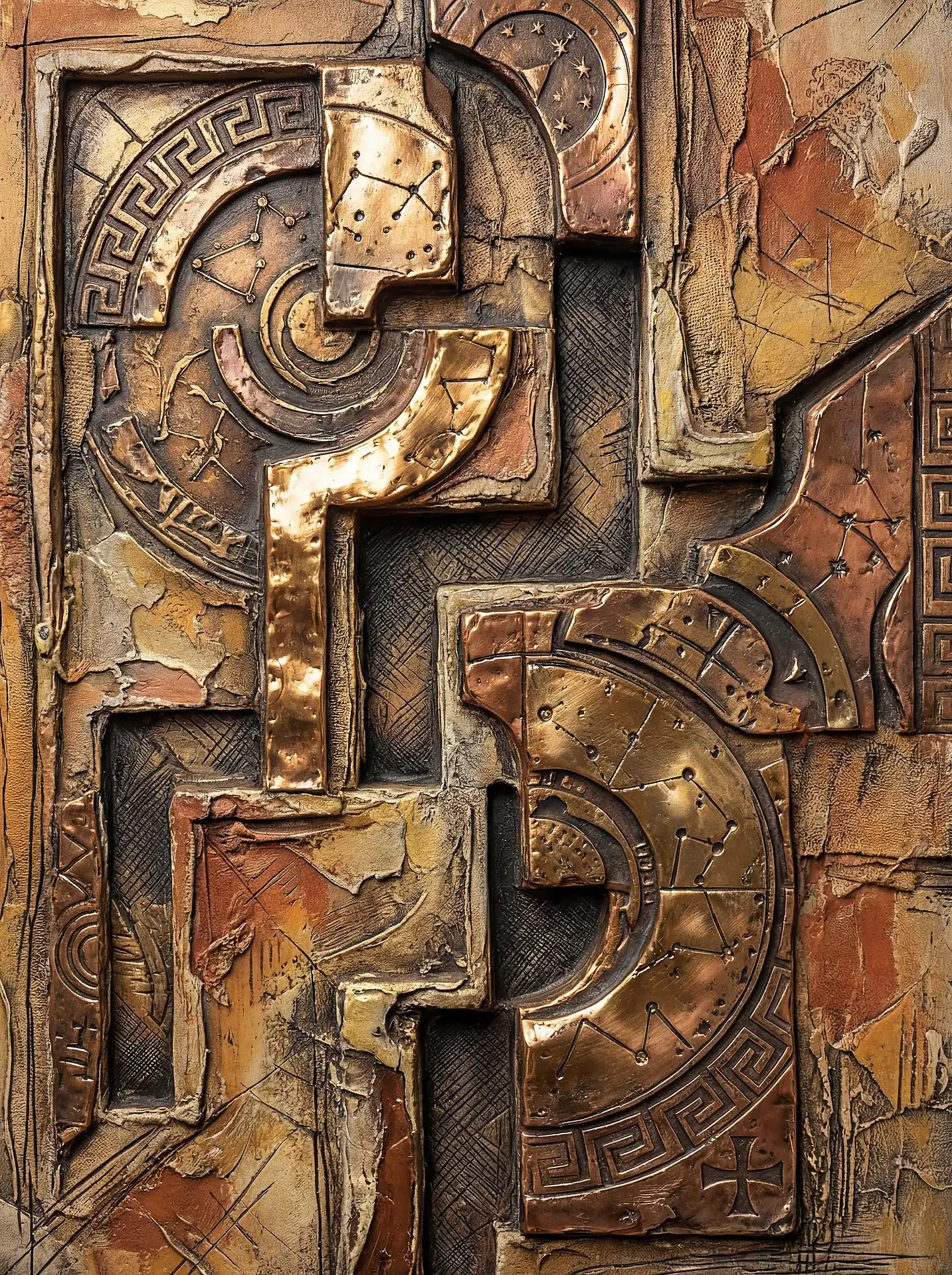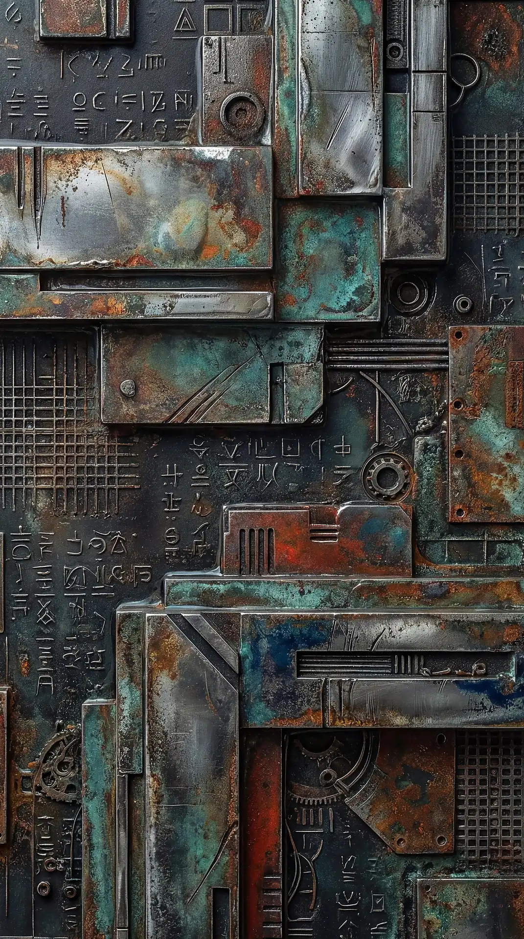 Color stays fundamentally grounded throughout these 173 Magnificent Industrial Relief Artworks. Copper and bronze absolutely dominate the palette—warm metallics ranging from bright new-penny gleam to dark aged-chocolate depth. Turquoise accents cut through strategically, the distinctive blue-green of oxidized copper providing essential cool contrast against overwhelming warmth. Occasional rusts and ochres add earthy undertones. Deep charcoals provide shadow anchors. The overall palette feels genuinely dug from mineral earth, refined from raw ore, shaped over time by chemistry and atmospheric exposure.