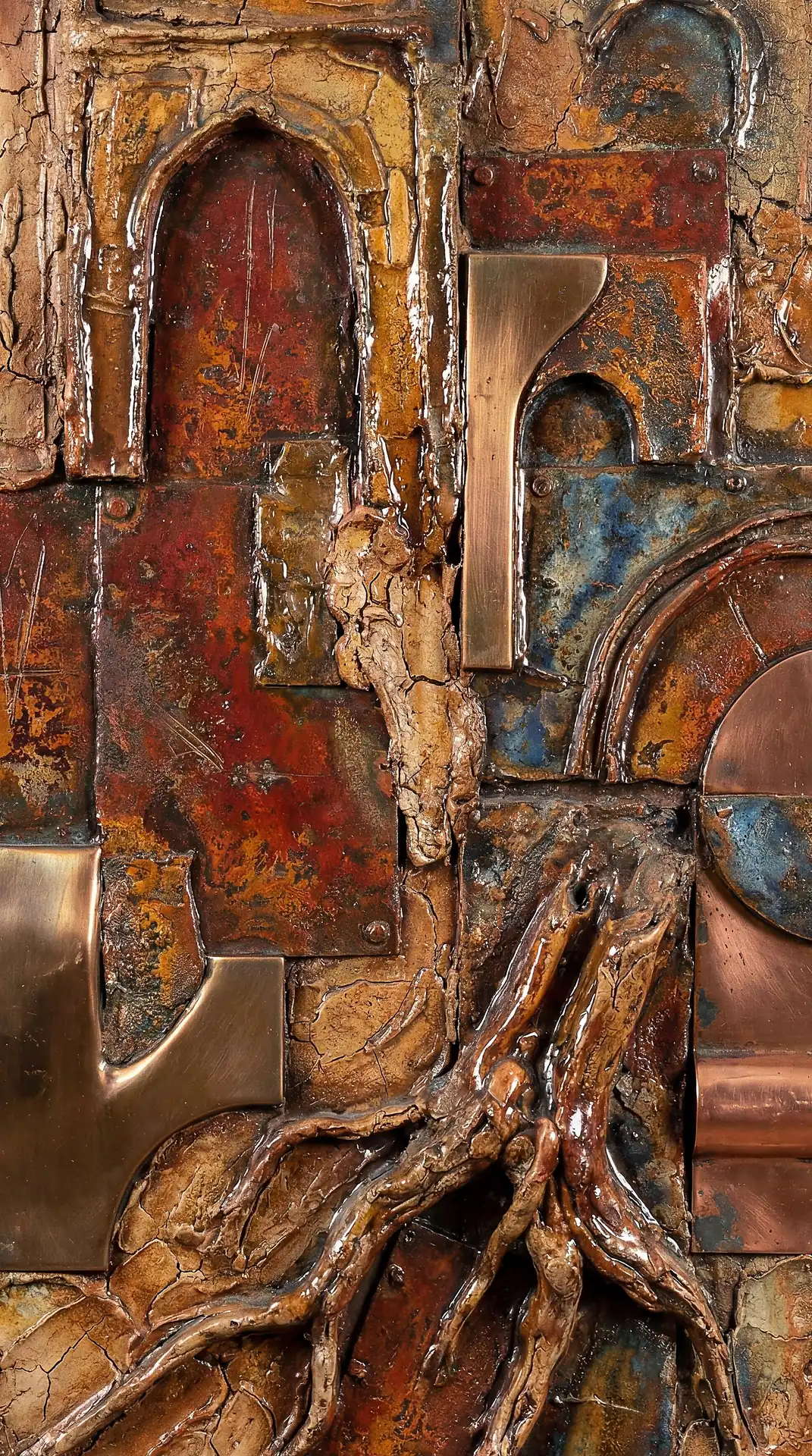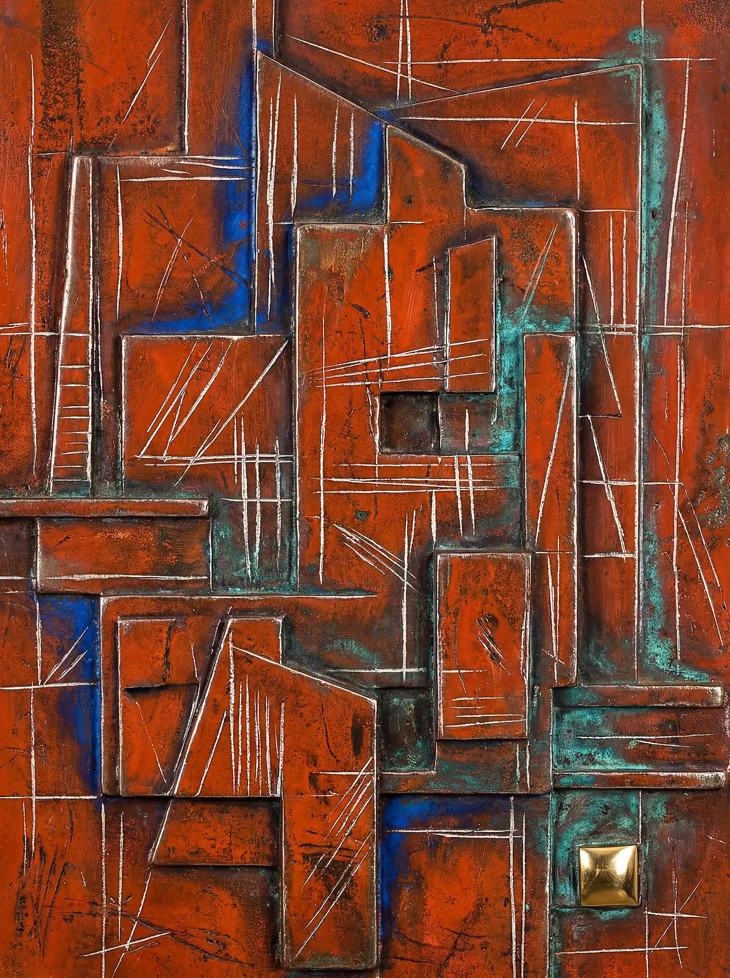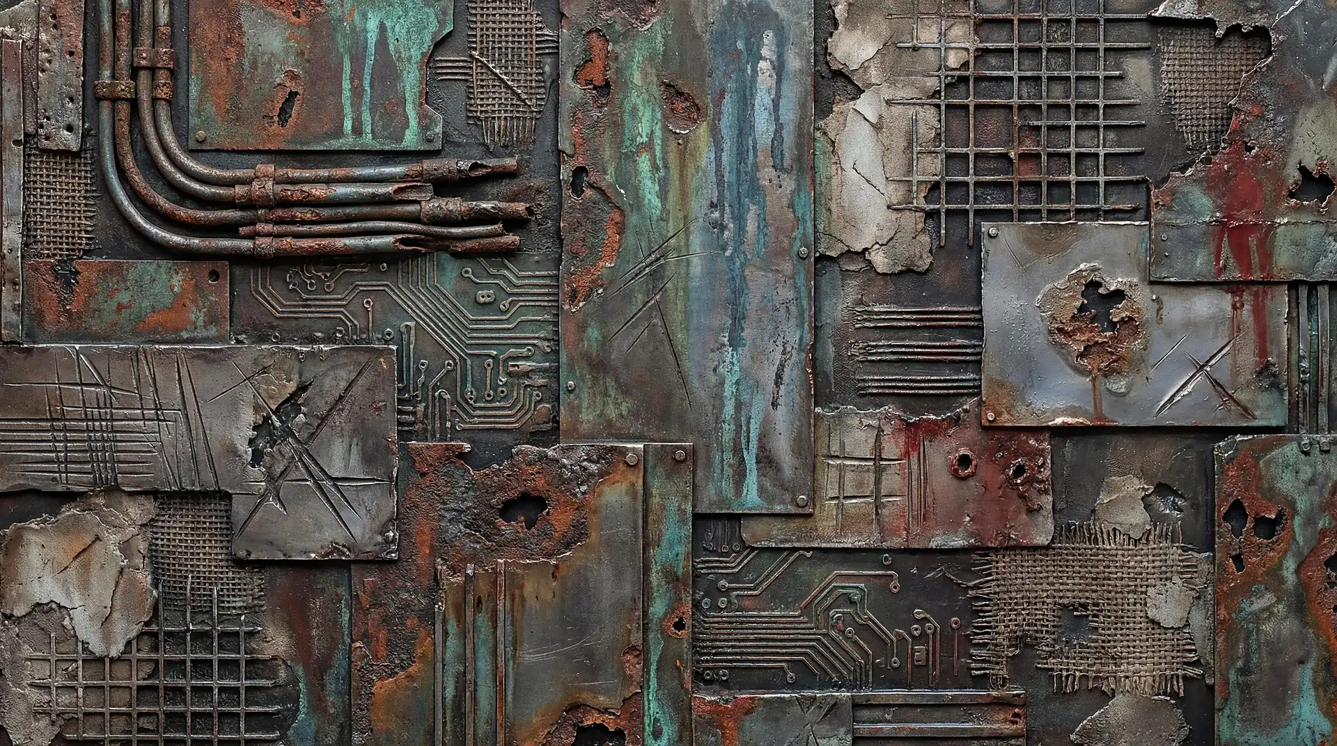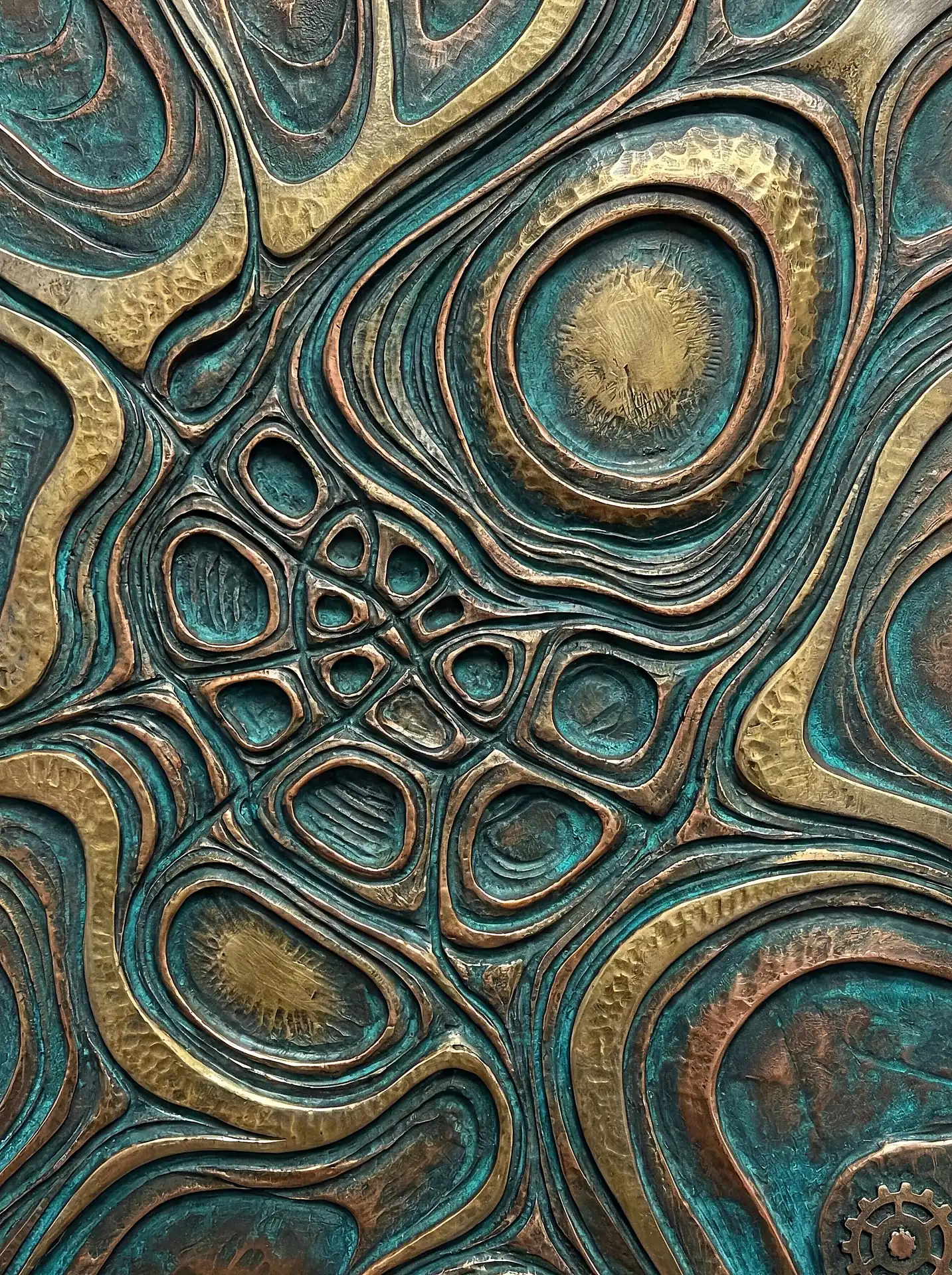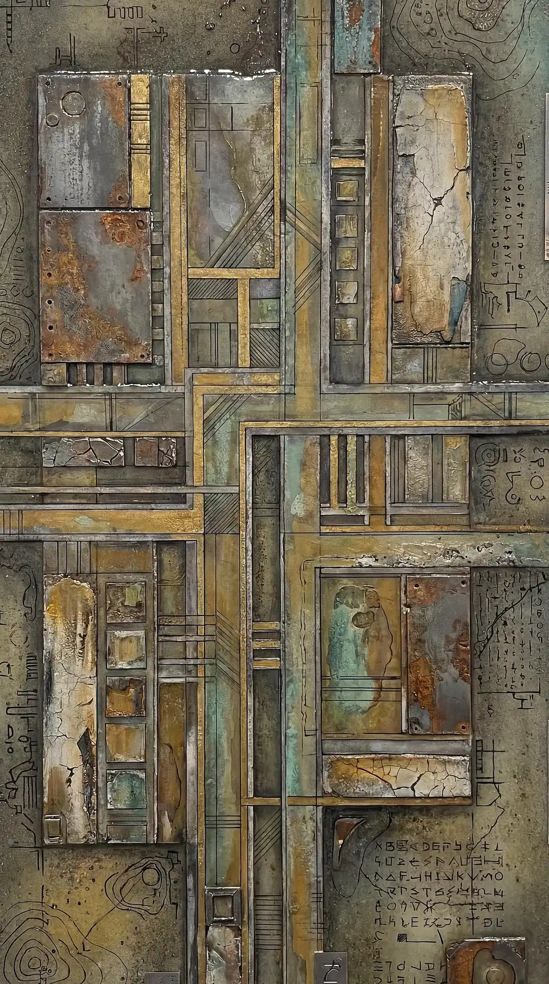 Color stays fundamentally grounded throughout these 173 Magnificent Industrial Relief Artworks. Copper and bronze absolutely dominate the palette—warm metallics ranging from bright new-penny gleam to dark aged-chocolate depth. Turquoise accents cut through strategically, the distinctive blue-green of oxidized copper providing essential cool contrast against overwhelming warmth. Occasional rusts and ochres add earthy undertones. Deep charcoals provide shadow anchors. The overall palette feels genuinely dug from mineral earth, refined from raw ore, shaped over time by chemistry and atmospheric exposure.