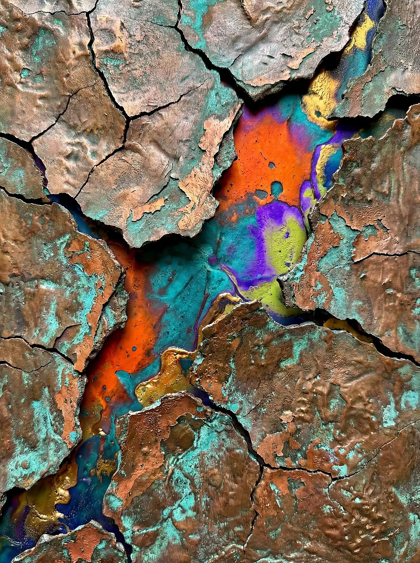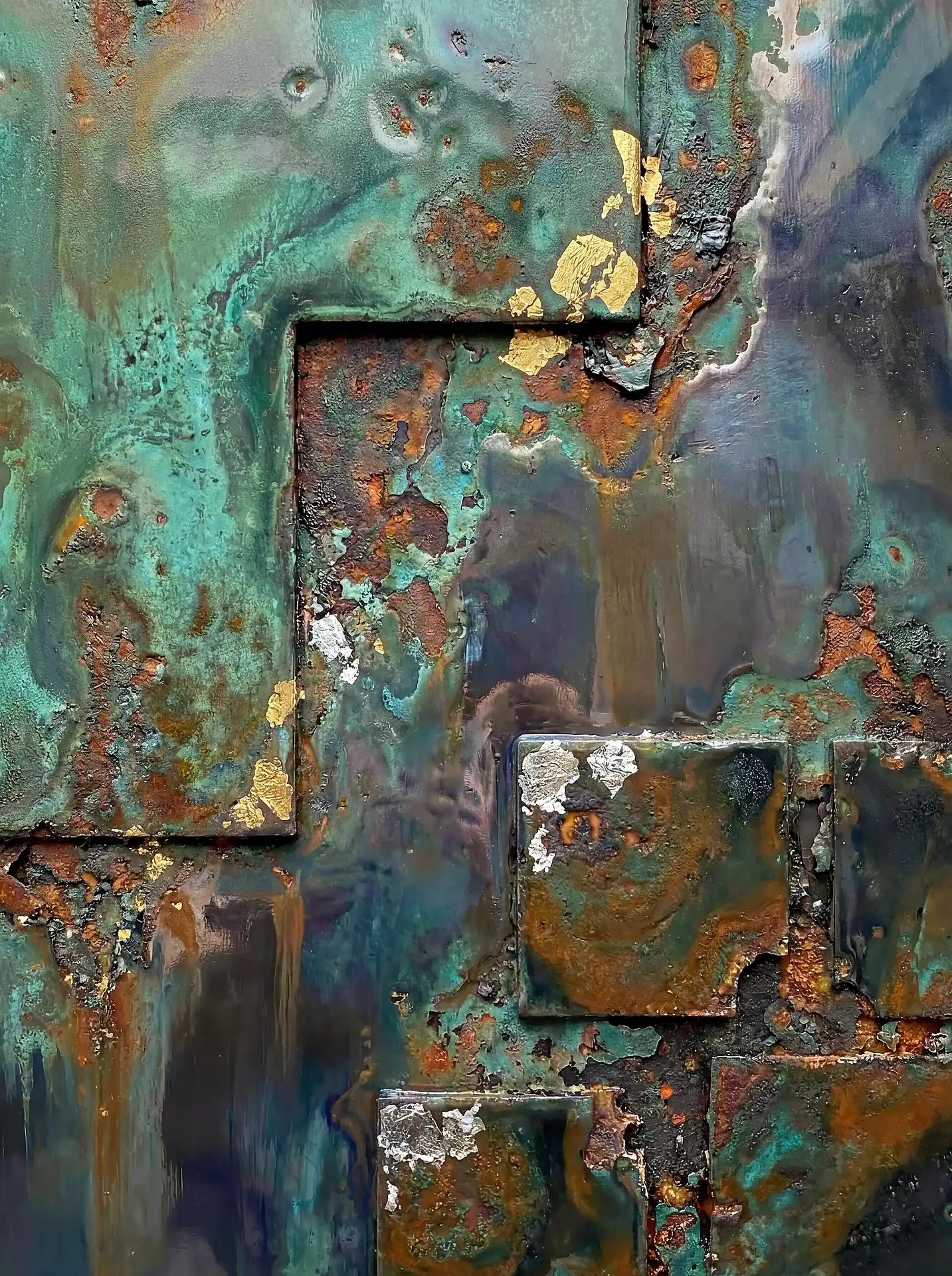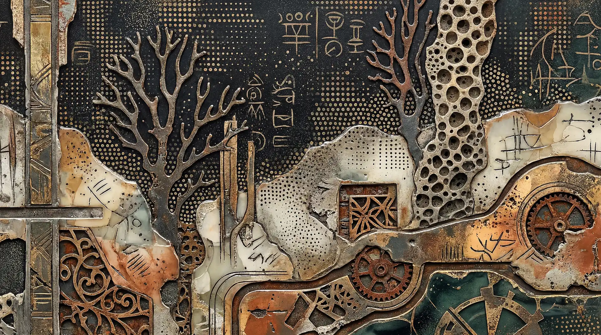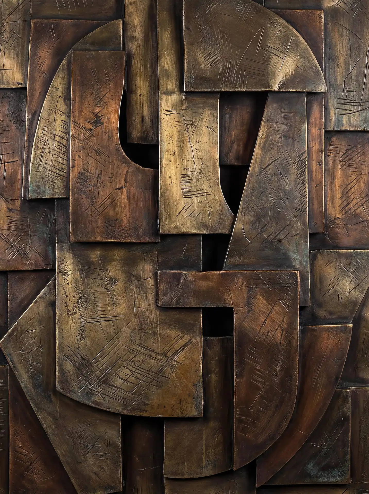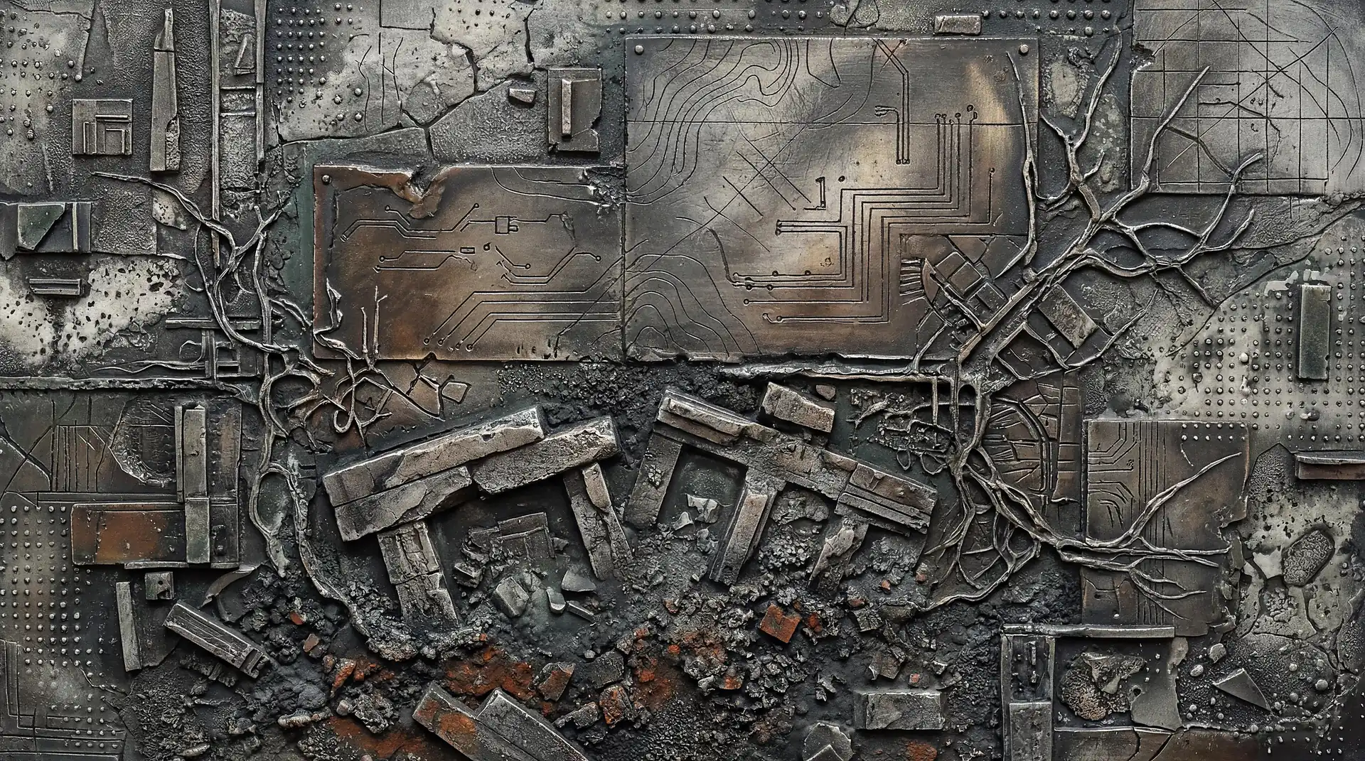 Color stays fundamentally grounded throughout these 173 Magnificent Industrial Relief Artworks. Copper and bronze absolutely dominate the palette—warm metallics ranging from bright new-penny gleam to dark aged-chocolate depth. Turquoise accents cut through strategically, the distinctive blue-green of oxidized copper providing essential cool contrast against overwhelming warmth. Occasional rusts and ochres add earthy undertones. Deep charcoals provide shadow anchors. The overall palette feels genuinely dug from mineral earth, refined from raw ore, shaped over time by chemistry and atmospheric exposure.