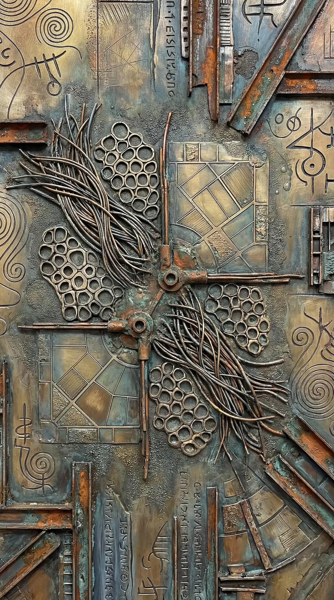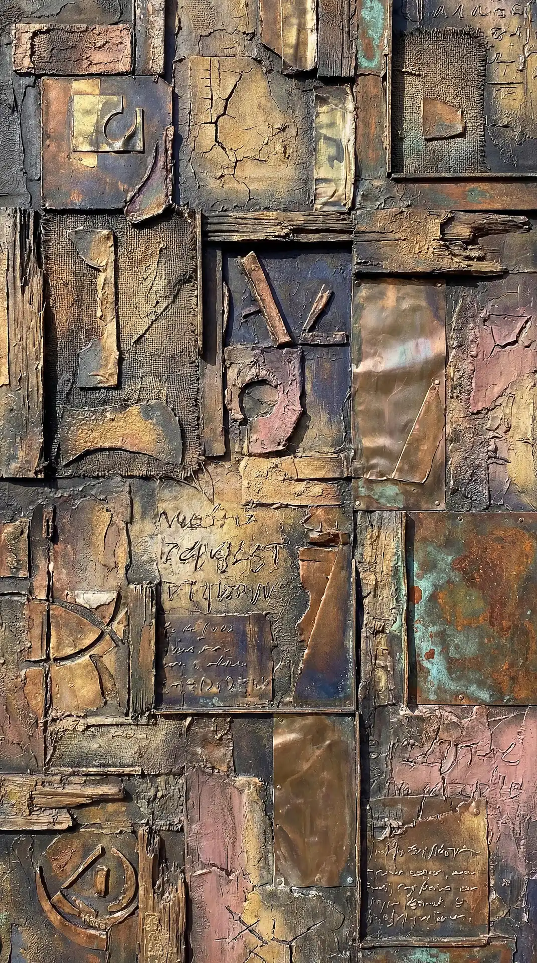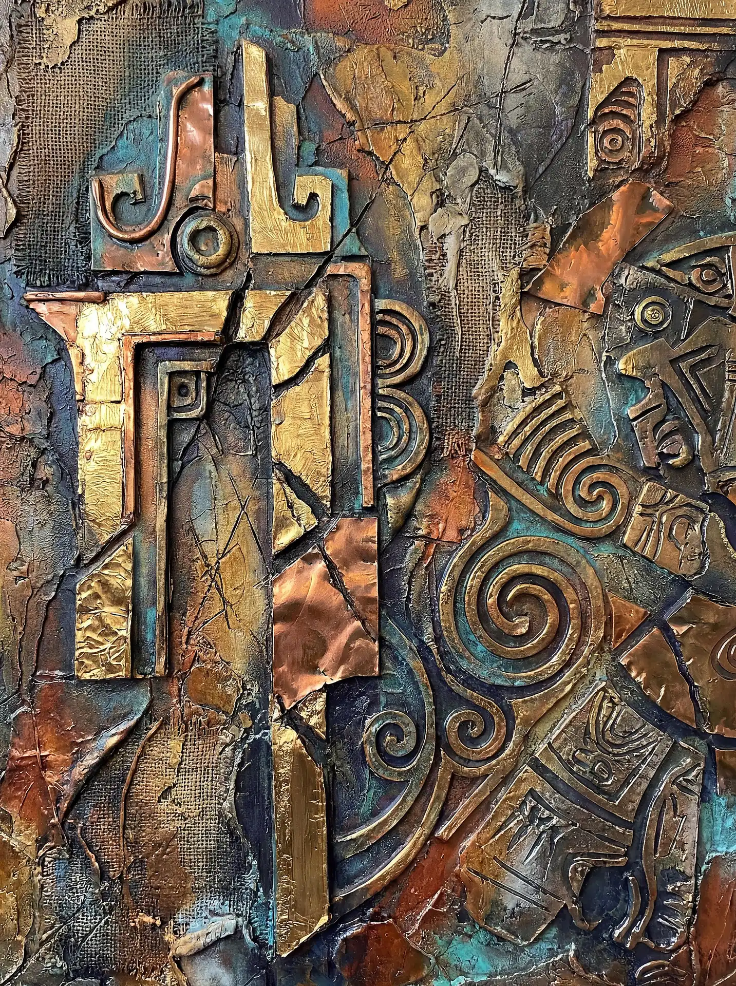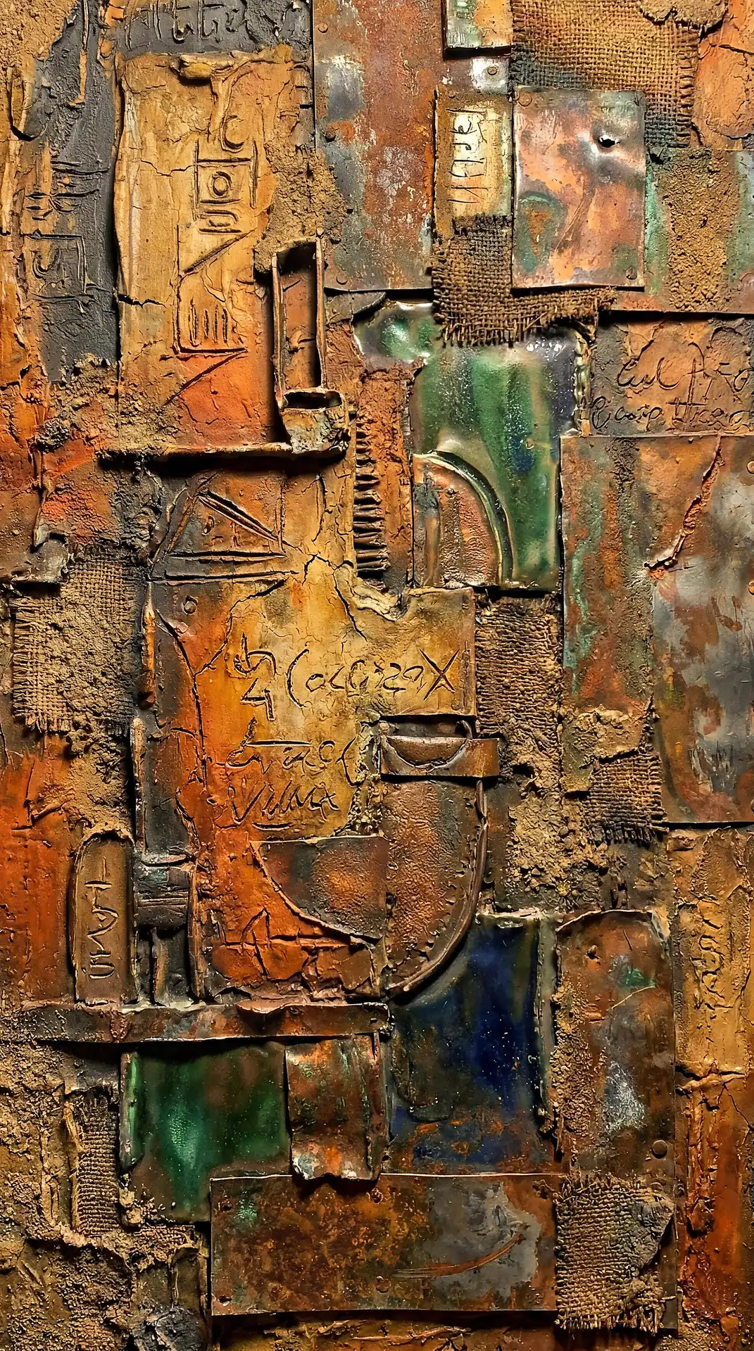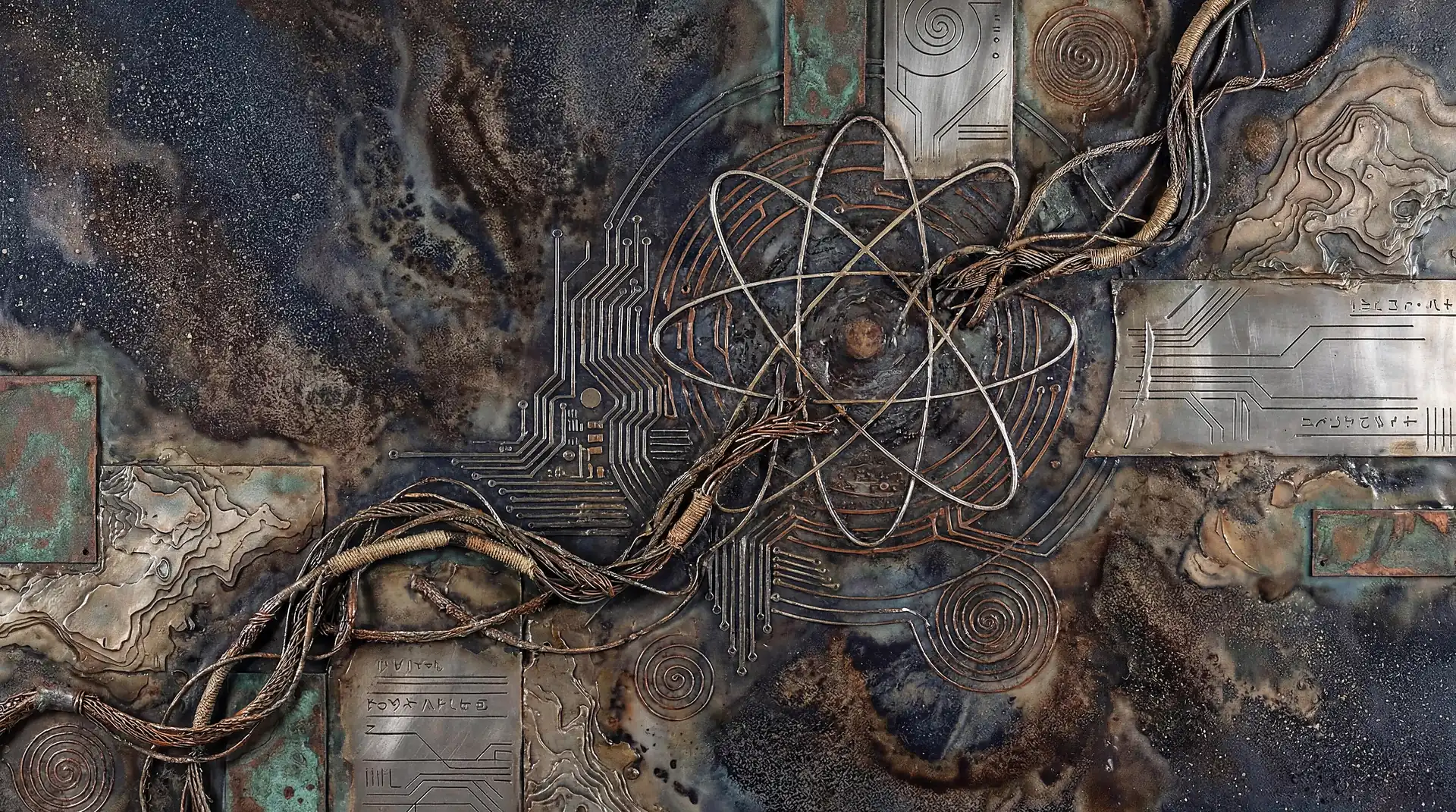 Color stays fundamentally grounded throughout these 173 Magnificent Industrial Relief Artworks. Copper and bronze absolutely dominate the palette—warm metallics ranging from bright new-penny gleam to dark aged-chocolate depth. Turquoise accents cut through strategically, the distinctive blue-green of oxidized copper providing essential cool contrast against overwhelming warmth. Occasional rusts and ochres add earthy undertones. Deep charcoals provide shadow anchors. The overall palette feels genuinely dug from mineral earth, refined from raw ore, shaped over time by chemistry and atmospheric exposure.