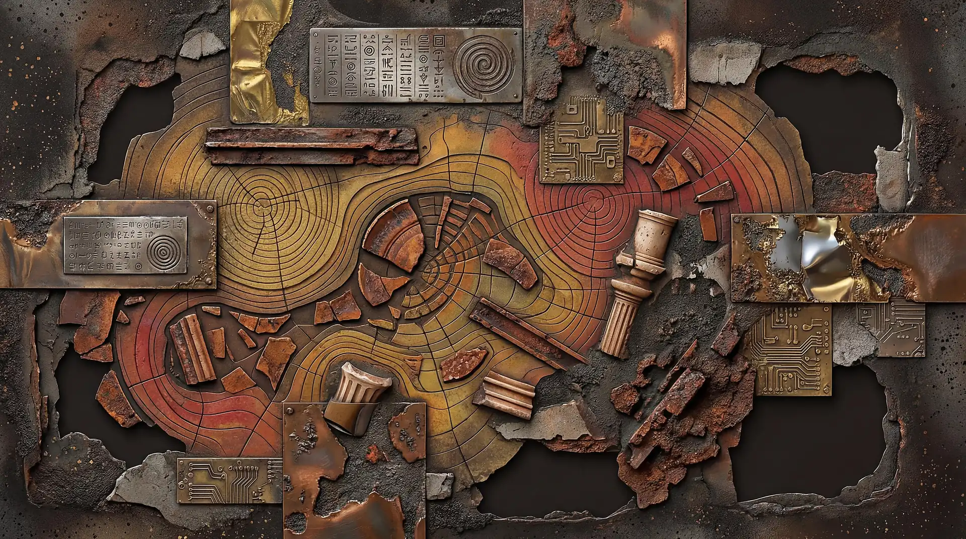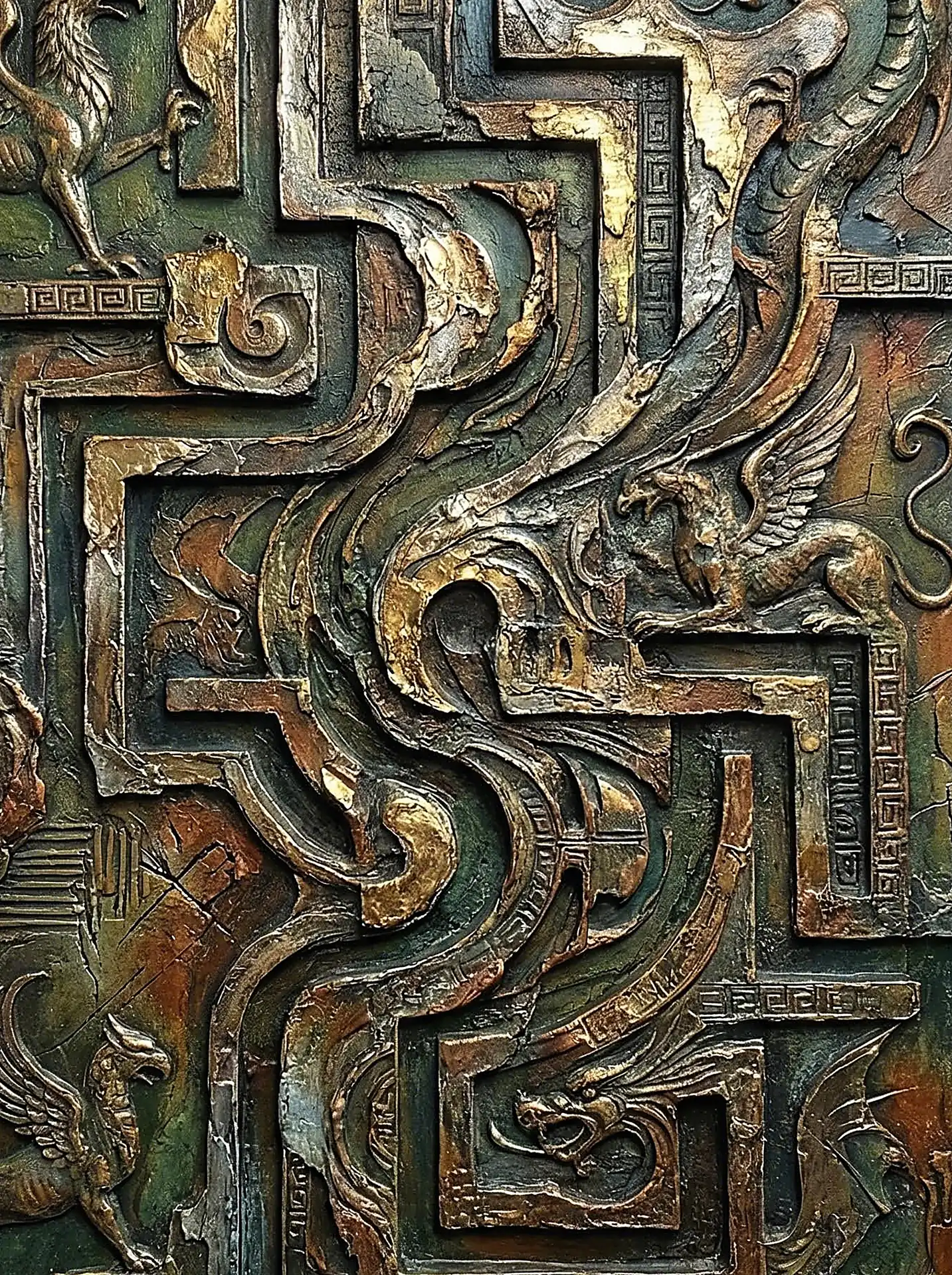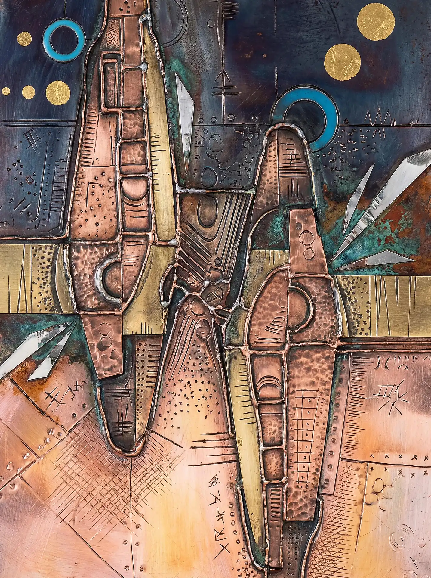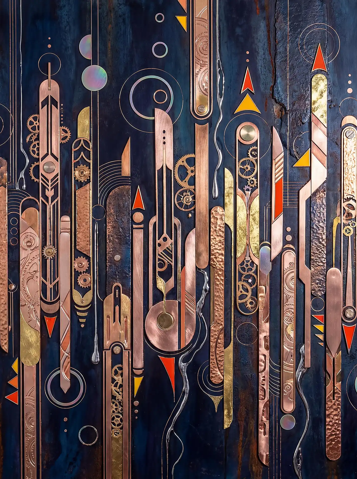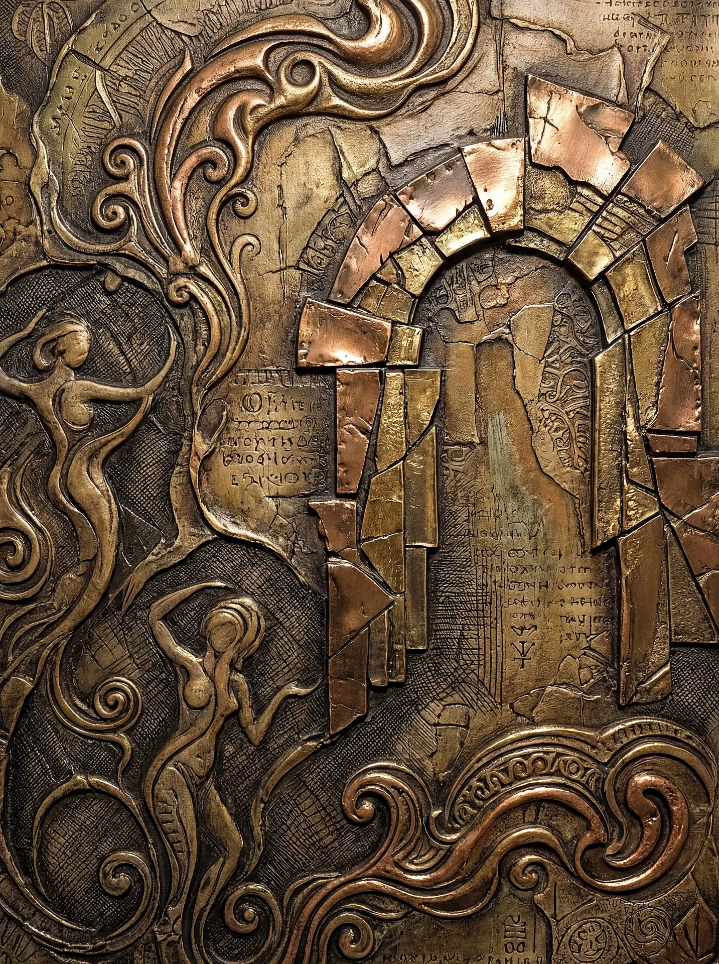 Color stays fundamentally grounded throughout these 173 Magnificent Industrial Relief Artworks. Copper and bronze absolutely dominate the palette—warm metallics ranging from bright new-penny gleam to dark aged-chocolate depth. Turquoise accents cut through strategically, the distinctive blue-green of oxidized copper providing essential cool contrast against overwhelming warmth. Occasional rusts and ochres add earthy undertones. Deep charcoals provide shadow anchors. The overall palette feels genuinely dug from mineral earth, refined from raw ore, shaped over time by chemistry and atmospheric exposure.