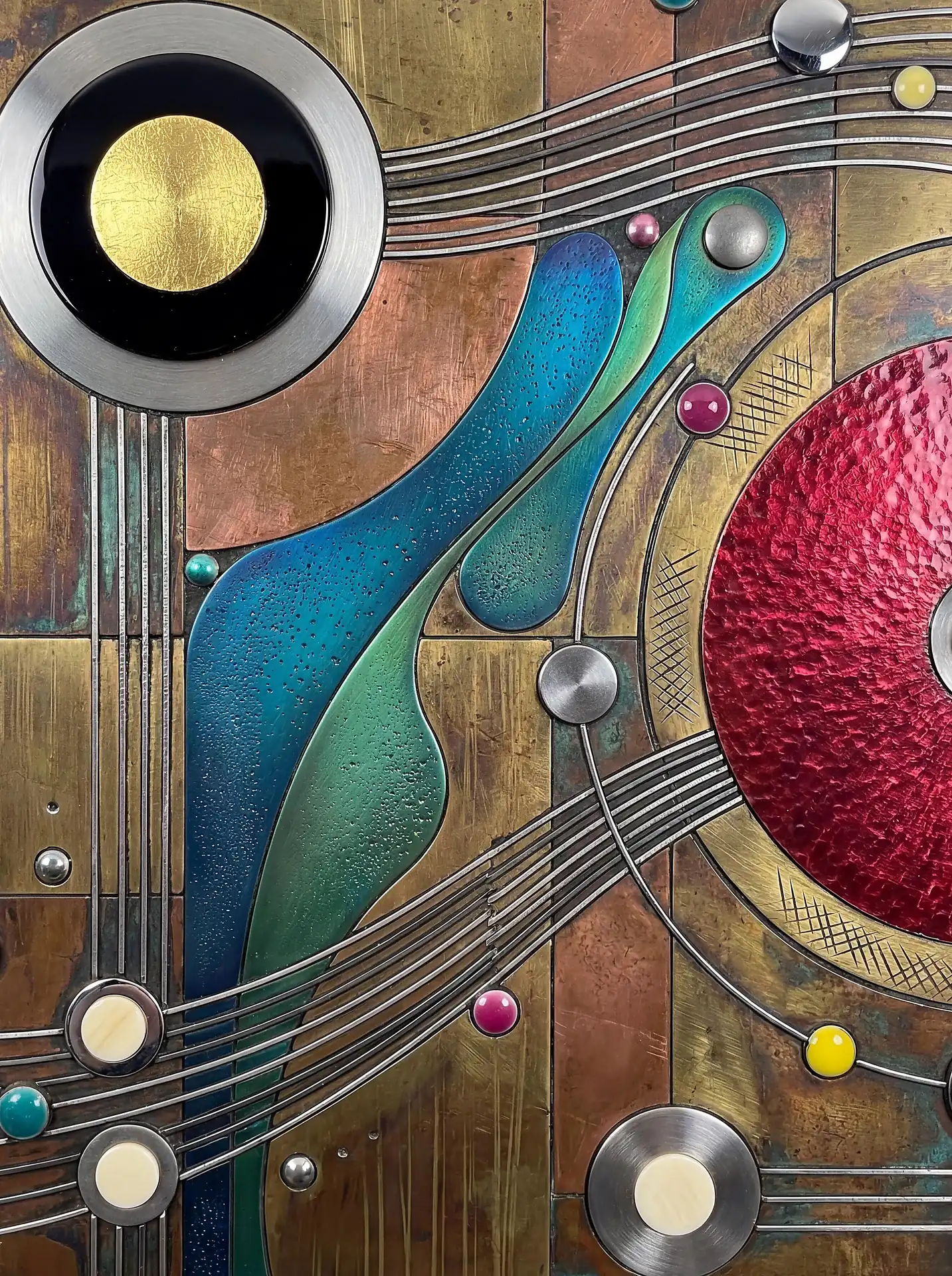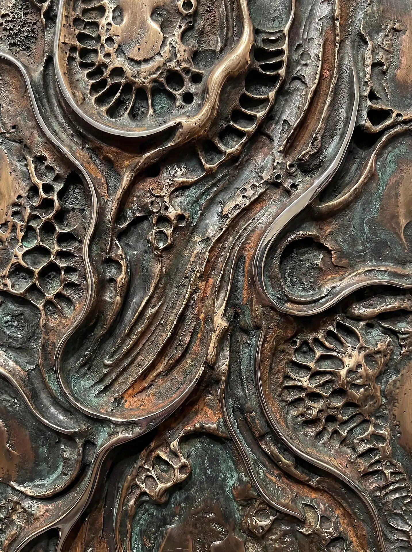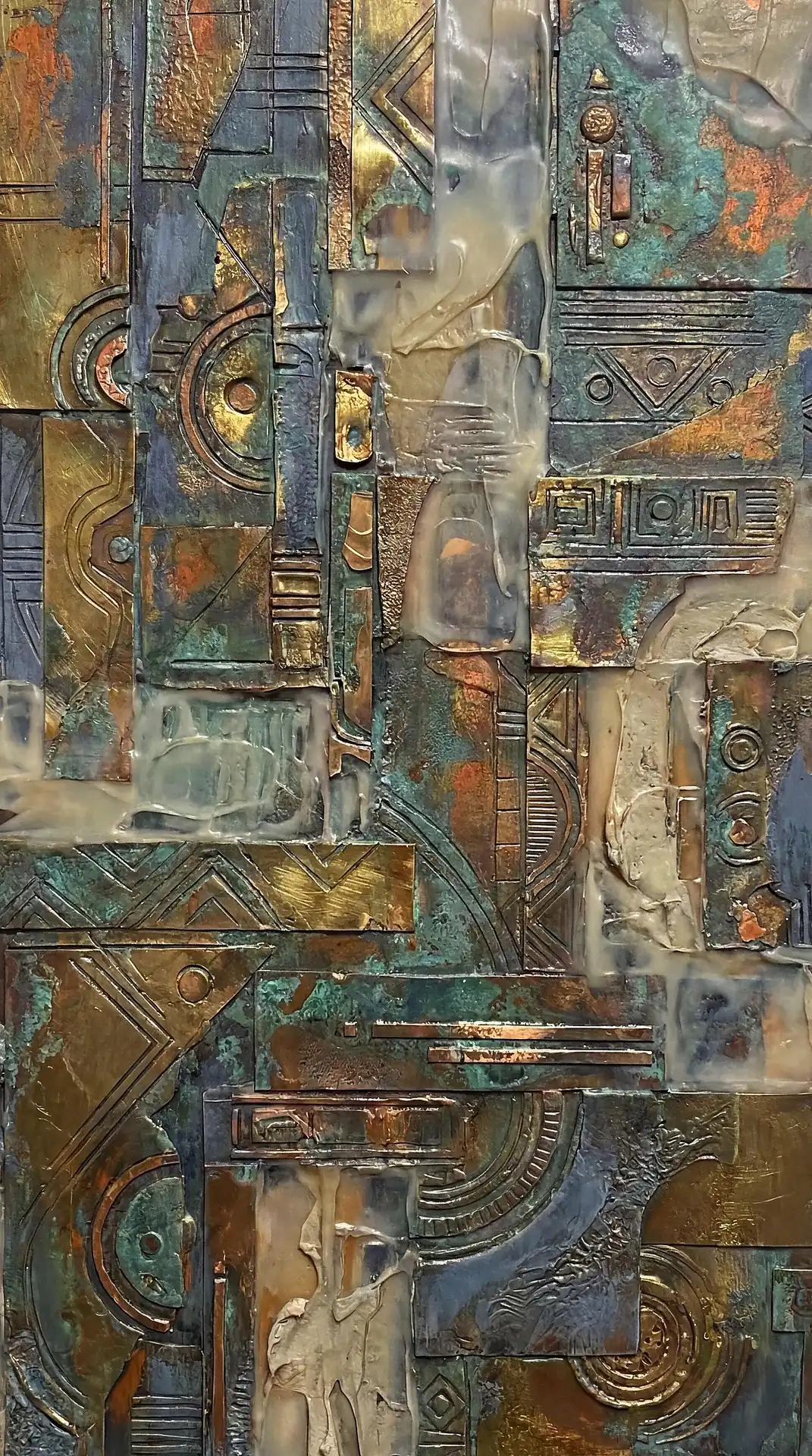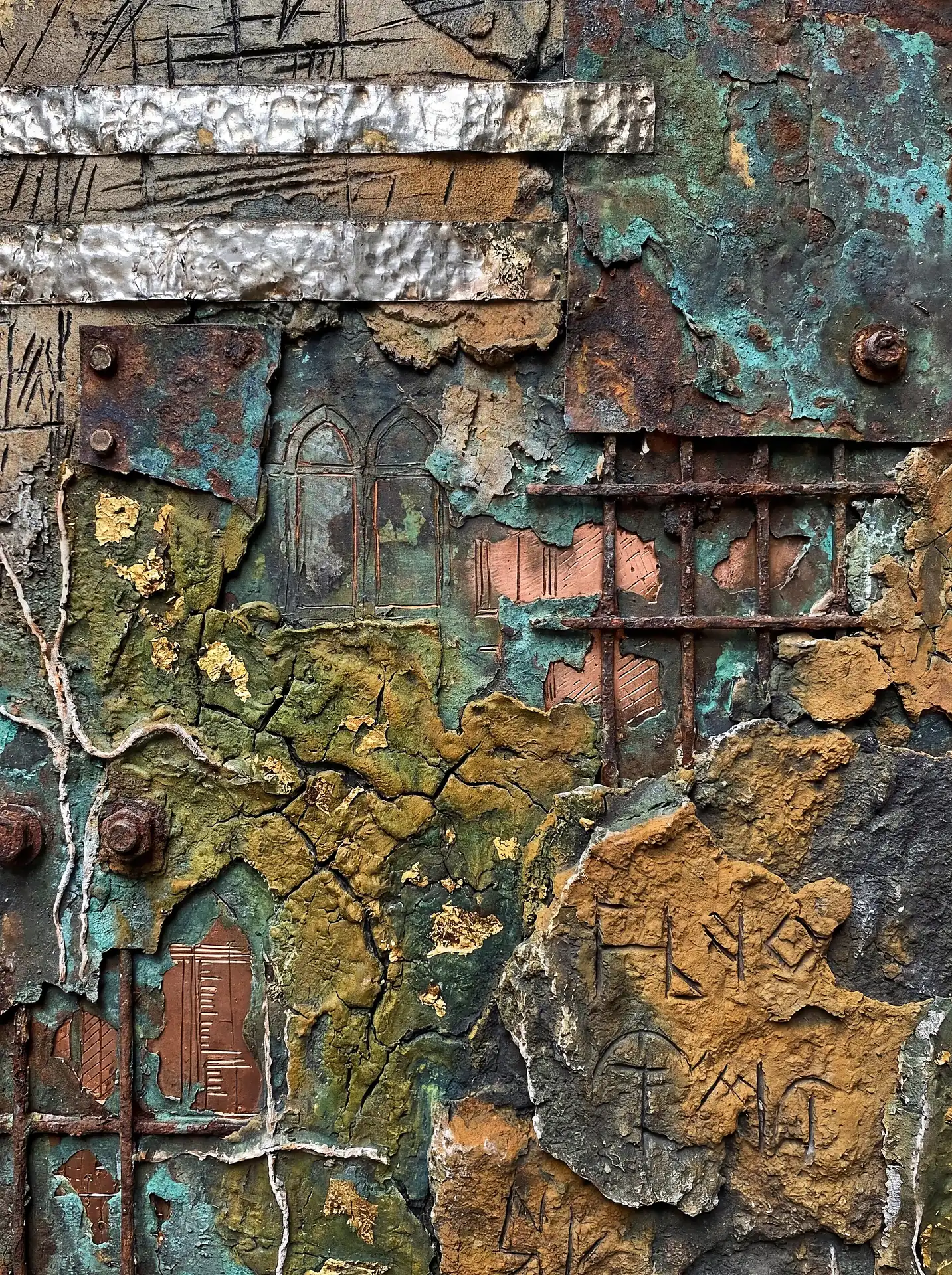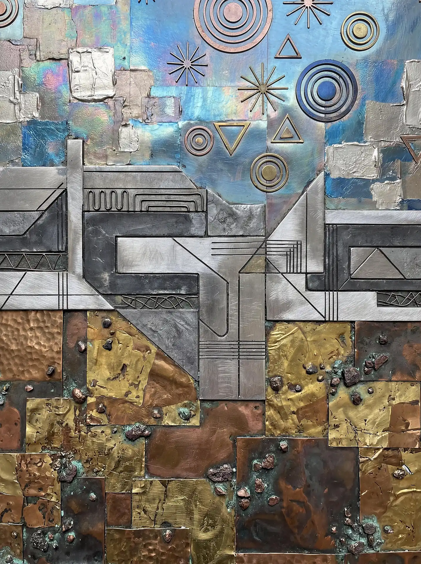 Color stays fundamentally grounded throughout these 173 Magnificent Industrial Relief Artworks. Copper and bronze absolutely dominate the palette—warm metallics ranging from bright new-penny gleam to dark aged-chocolate depth. Turquoise accents cut through strategically, the distinctive blue-green of oxidized copper providing essential cool contrast against overwhelming warmth. Occasional rusts and ochres add earthy undertones. Deep charcoals provide shadow anchors. The overall palette feels genuinely dug from mineral earth, refined from raw ore, shaped over time by chemistry and atmospheric exposure.