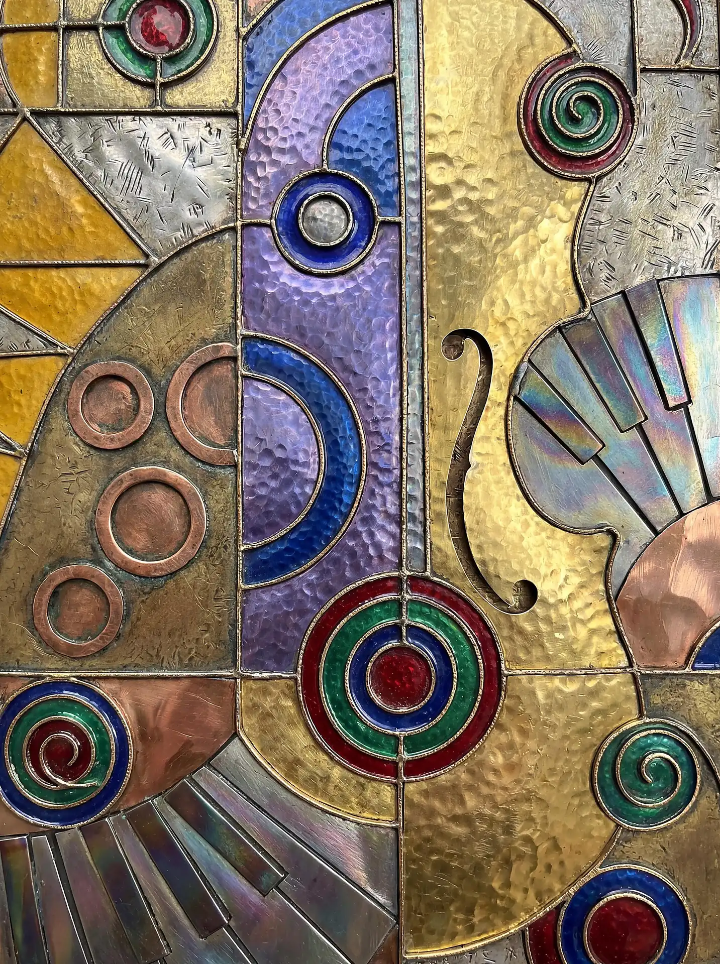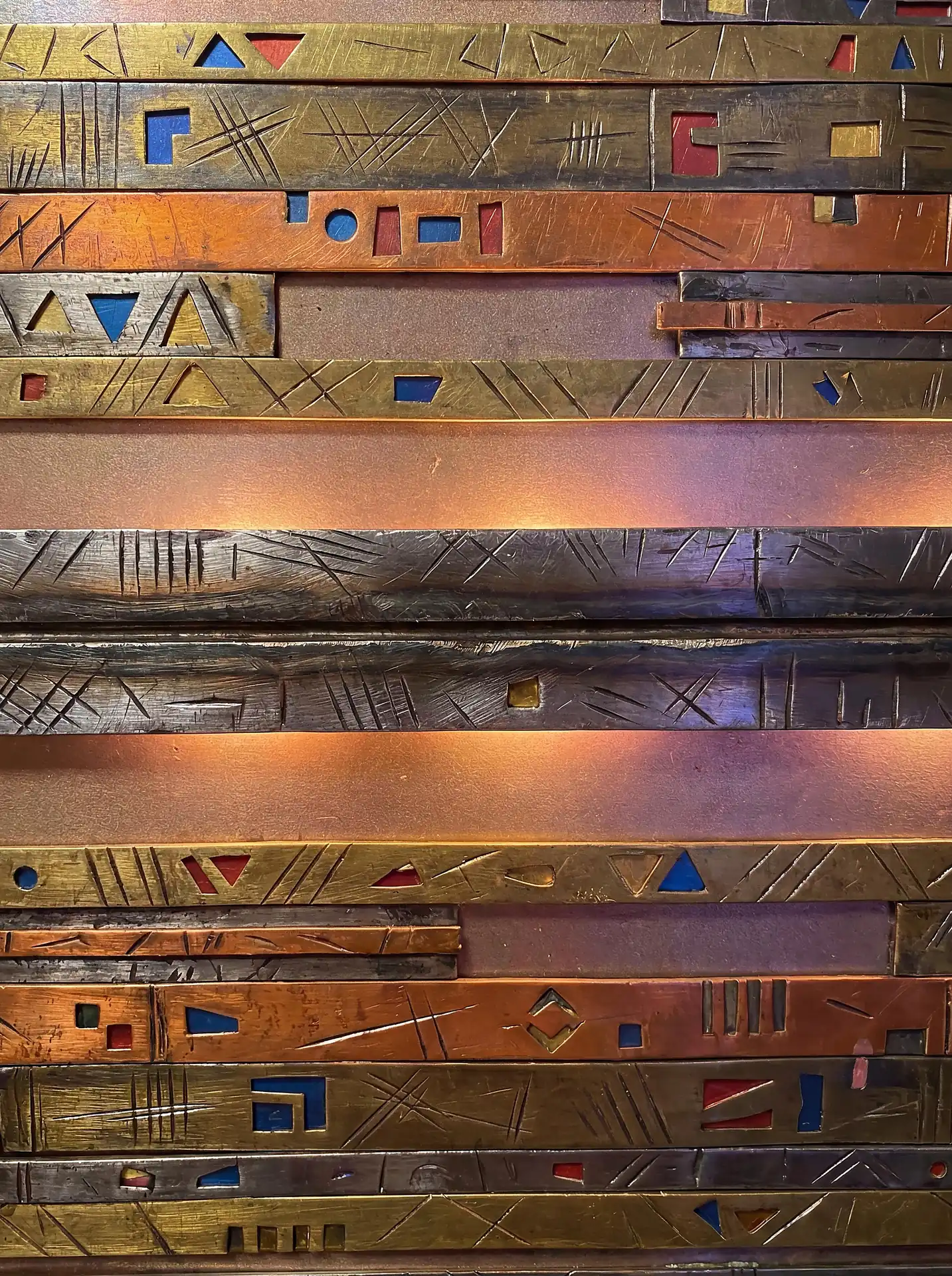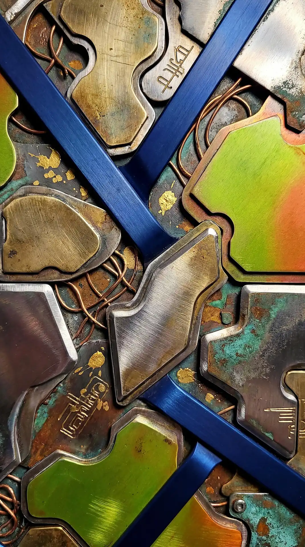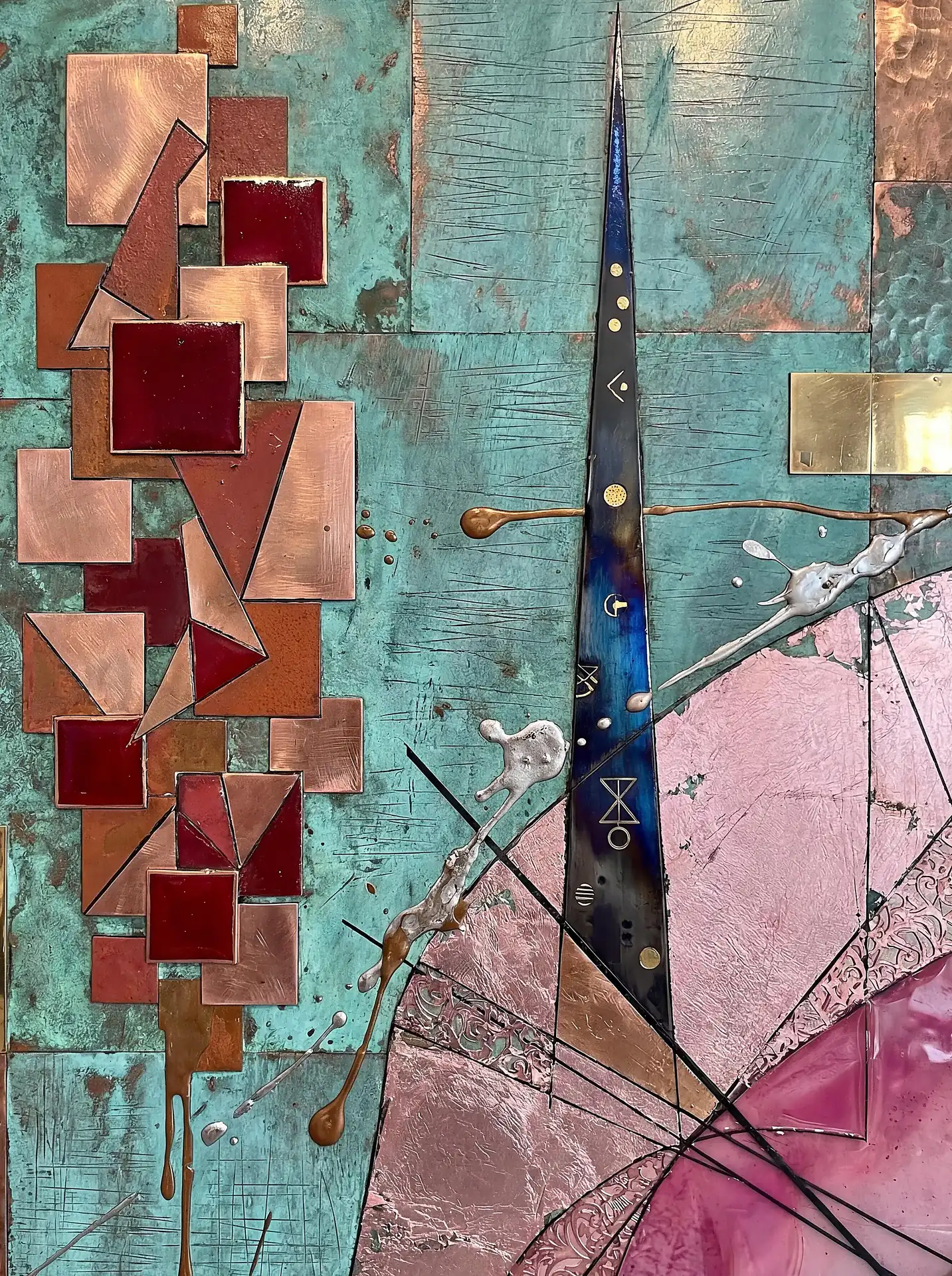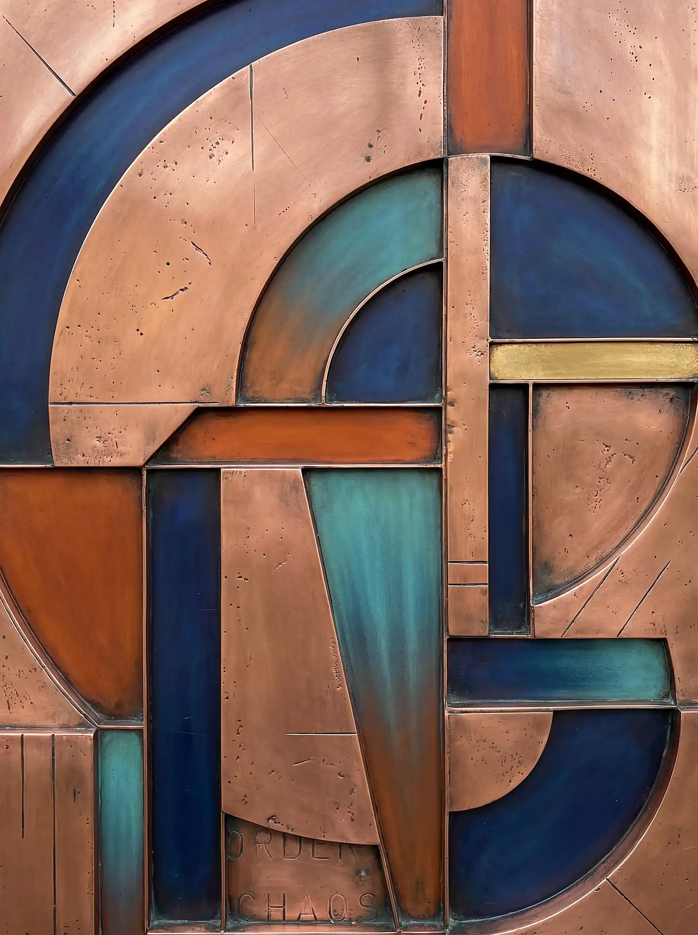 Color stays fundamentally grounded throughout these 173 Magnificent Industrial Relief Artworks. Copper and bronze absolutely dominate the palette—warm metallics ranging from bright new-penny gleam to dark aged-chocolate depth. Turquoise accents cut through strategically, the distinctive blue-green of oxidized copper providing essential cool contrast against overwhelming warmth. Occasional rusts and ochres add earthy undertones. Deep charcoals provide shadow anchors. The overall palette feels genuinely dug from mineral earth, refined from raw ore, shaped over time by chemistry and atmospheric exposure.