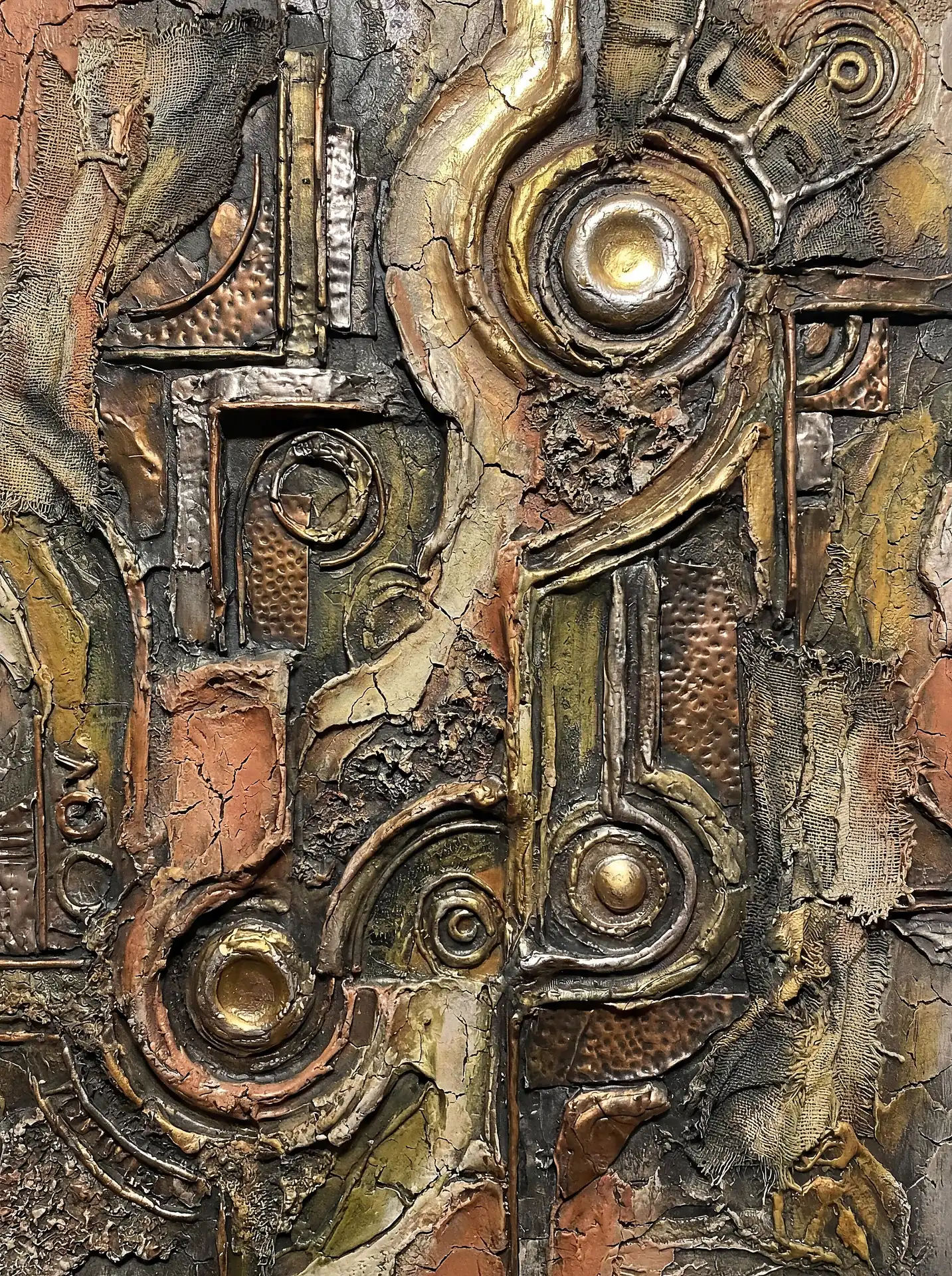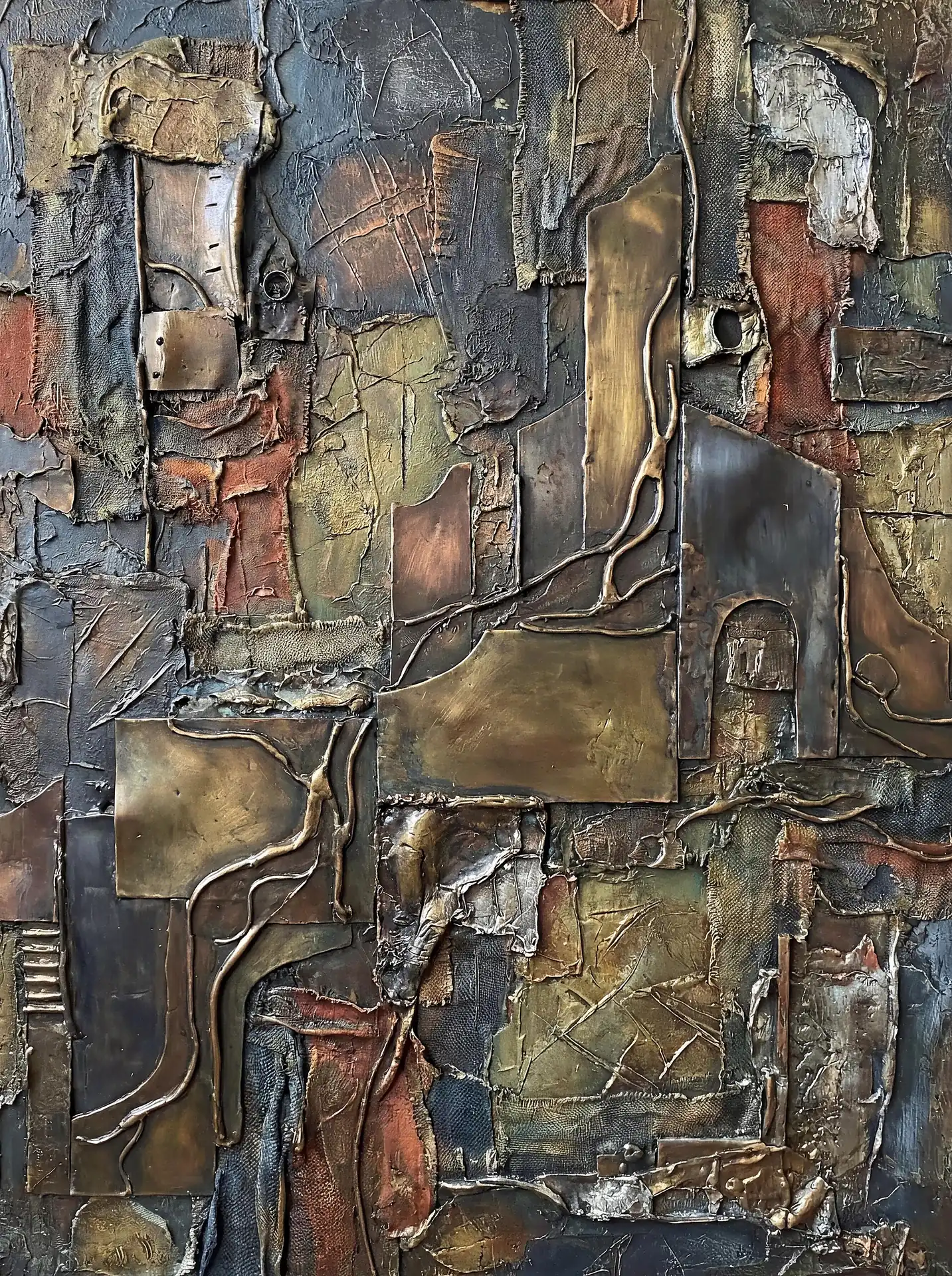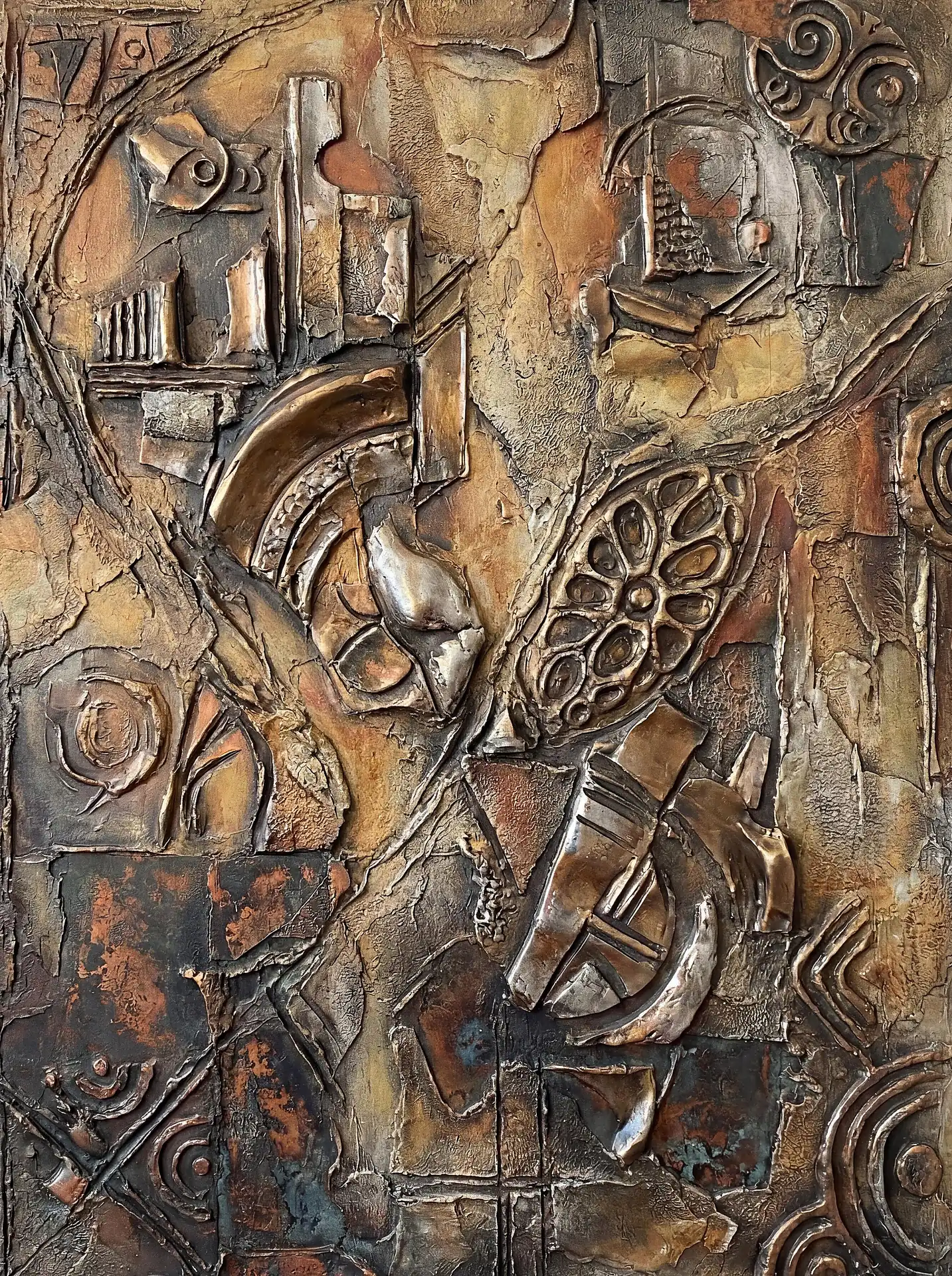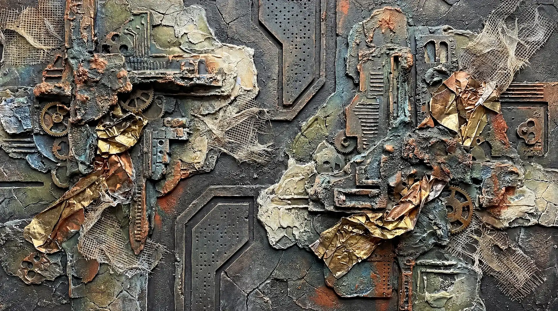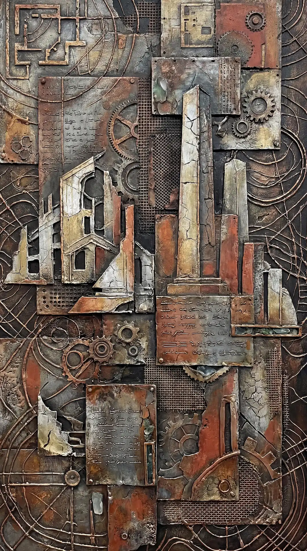 173 Magnificent Industrial Relief Artworks refuse to stay flat. These pieces push outward from their surfaces, building dimension through layered forms that cast real shadows across their own topographies. The work occupies contested territory between painting and sculpture, creating objects that exist in actual physical space rather than merely depicting imaginary space on canvas. Every piece demands to be walked around, examined from angles, experienced as a three-dimensional presence.