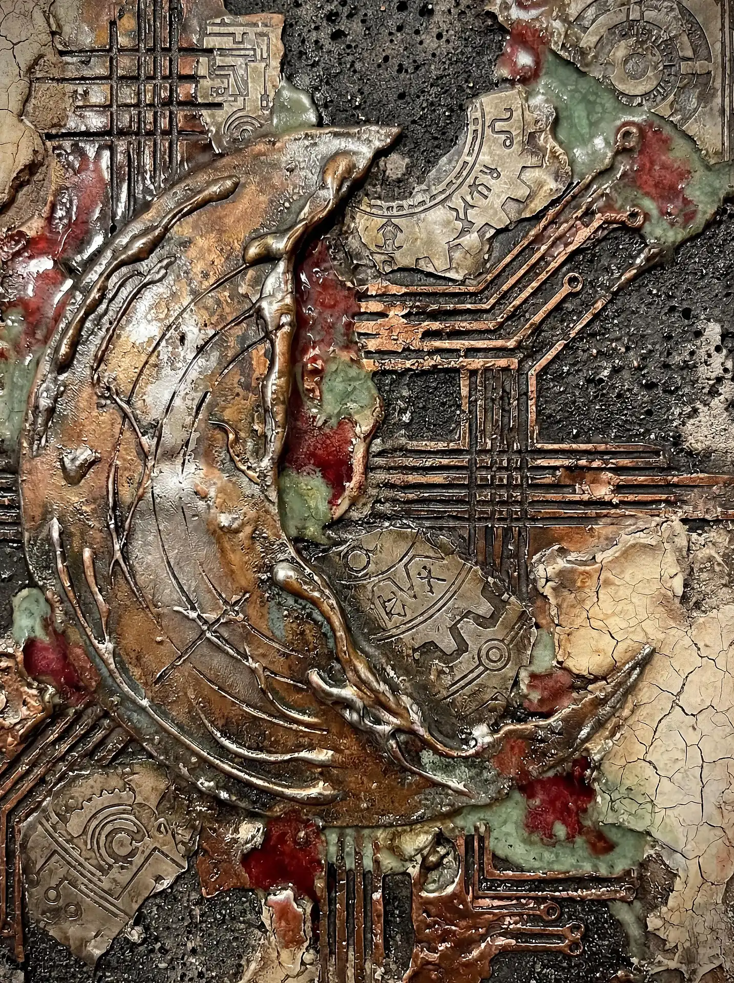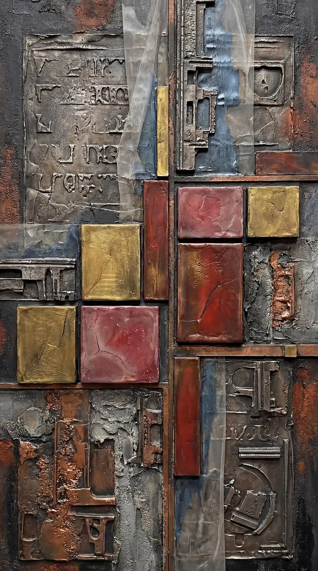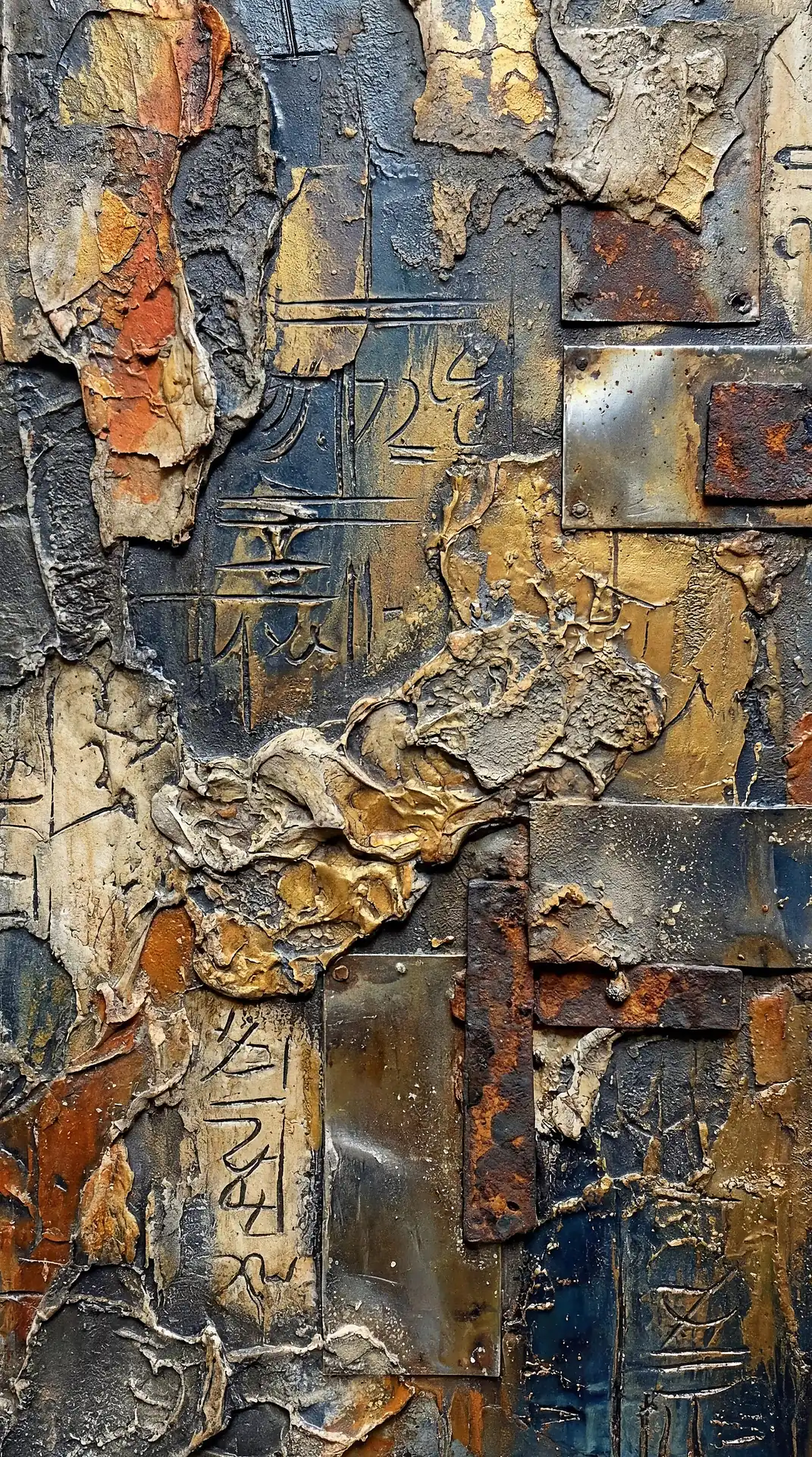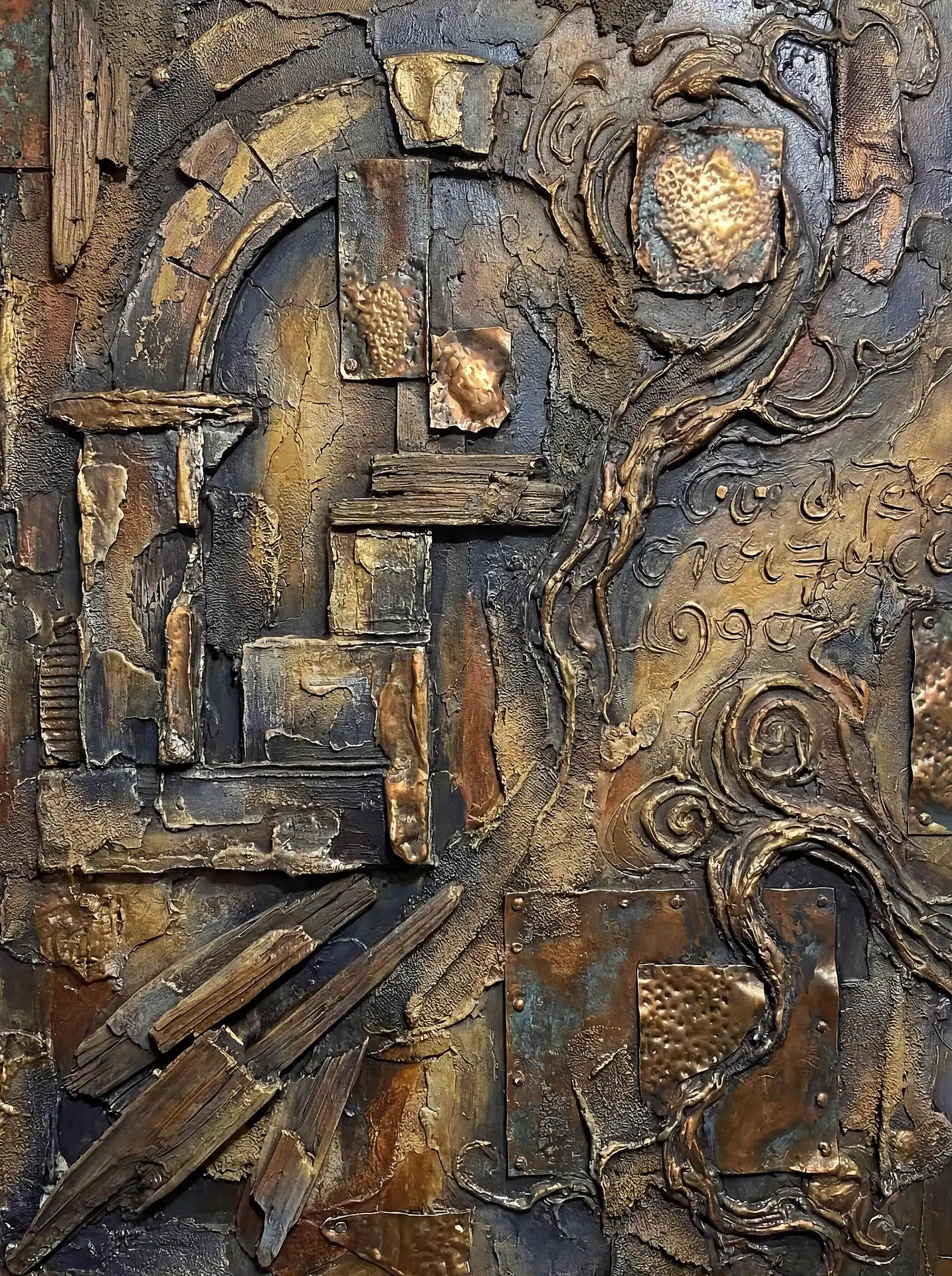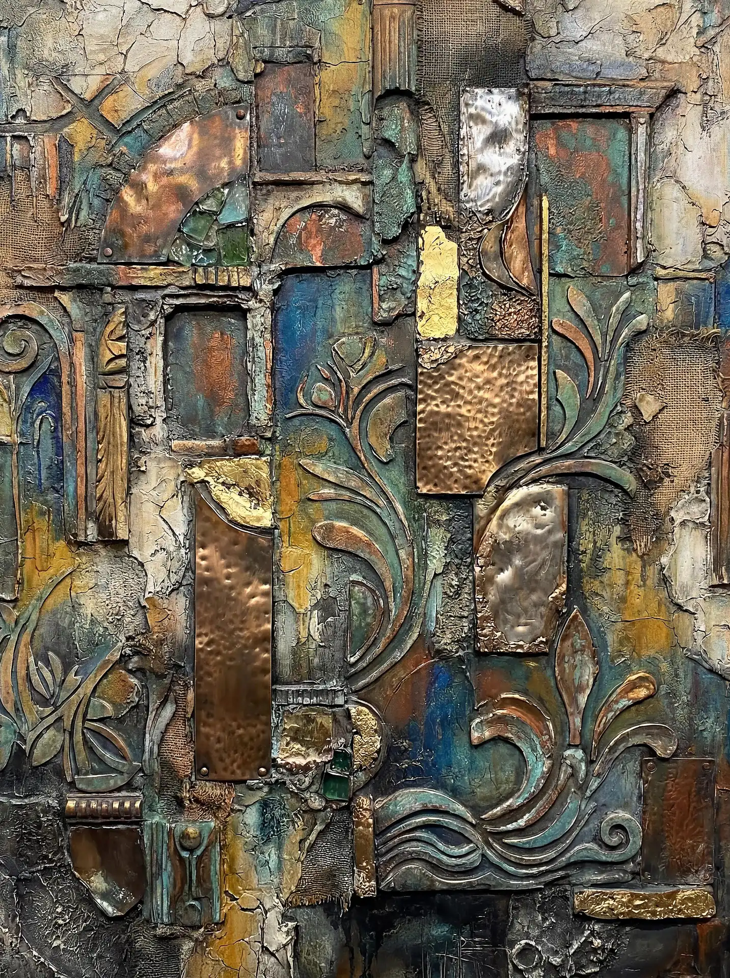 173 Magnificent Industrial Relief Artworks refuse to stay flat. These pieces push outward from their surfaces, building dimension through layered forms that cast real shadows across their own topographies. The work occupies contested territory between painting and sculpture, creating objects that exist in actual physical space rather than merely depicting imaginary space on canvas. Every piece demands to be walked around, examined from angles, experienced as a three-dimensional presence.
