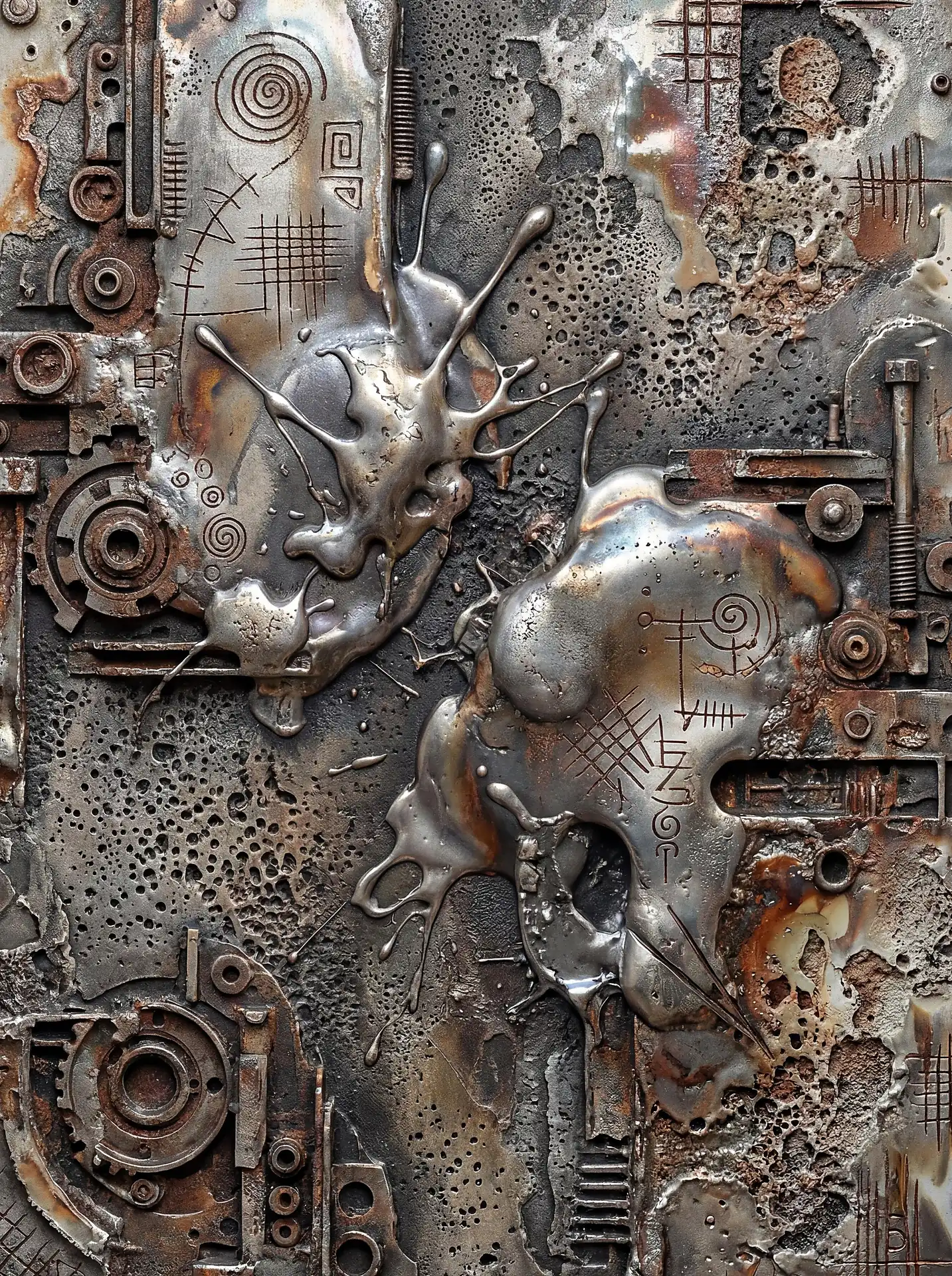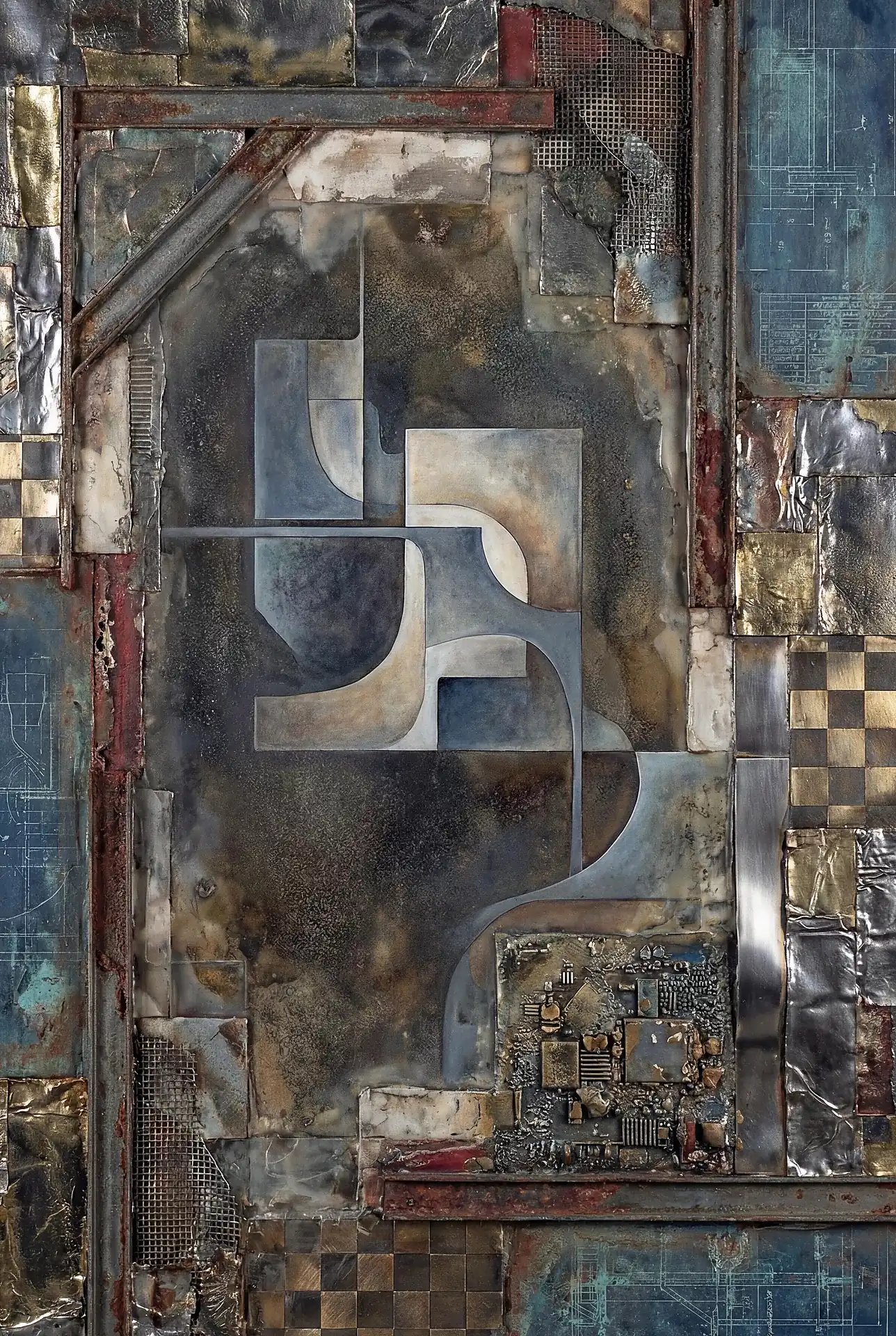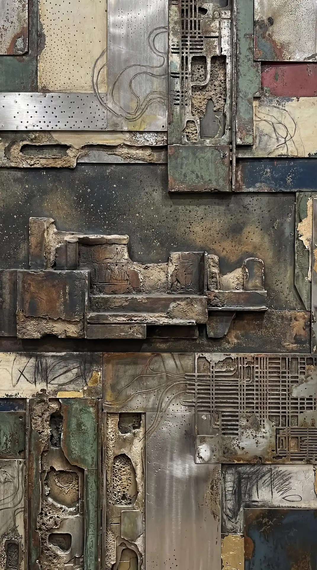 Every square inch of these 173 Magnificent Industrial Relief Artworks carries intense surface incident demanding attention. Smooth polished areas suddenly give way to rough corroded patches. Sections that gleam with apparent recent finishing neighbor deeply pitted zones suggesting centuries of exposure. The eye can almost physically feel what exploring fingers would discover—the cool of metal, the grit of crystalline corrosion, the sharp edges where fabricated plates meet and overlap. The work powerfully activates tactile imagination, making viewers newly conscious of their hands and their frustrated desire to reach out and touch. This texture operates simultaneously at multiple scales demanding different viewing distances. Large sculptural forms create overall compositional rhythm visible from across the room. Medium-scale details add complexity rewarding approach to arm’s length. Fine textures—individual brush marks, granular mineral deposits, hairline stress cracks—reveal themselves only to close examination from inches away. The pieces contain far more visual information than any single viewing from any single distance can possibly absorb, guaranteeing fresh discoveries on return visits.
