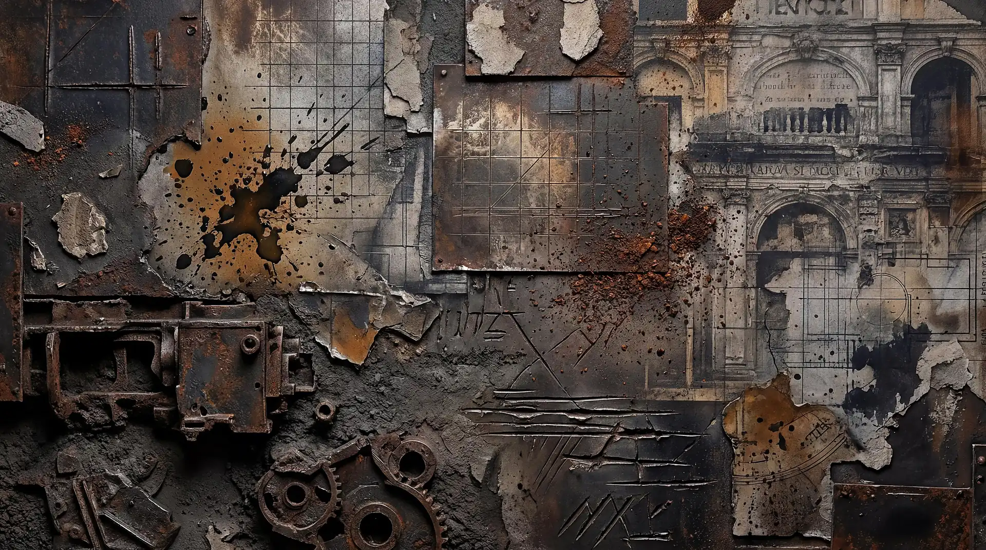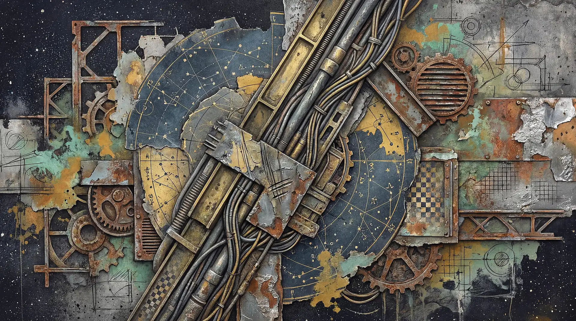 Gears, pipes, circuits, connectors, and junction boxes populate these 173 Magnificent Industrial Relief Artworks. The vocabulary borrows heavily from engineering and manufacturing—flanges and housings, conduits and mounting brackets, valve assemblies and pressure gauges—but deploys these mechanical elements entirely without functional logic. Nothing actually connects to anything else in any operational sense. Systems begin arbitrarily and end just as arbitrarily. The mechanical language becomes purely decorative, industrial syntax repurposed exclusively for visual rhythm and compositional structure.